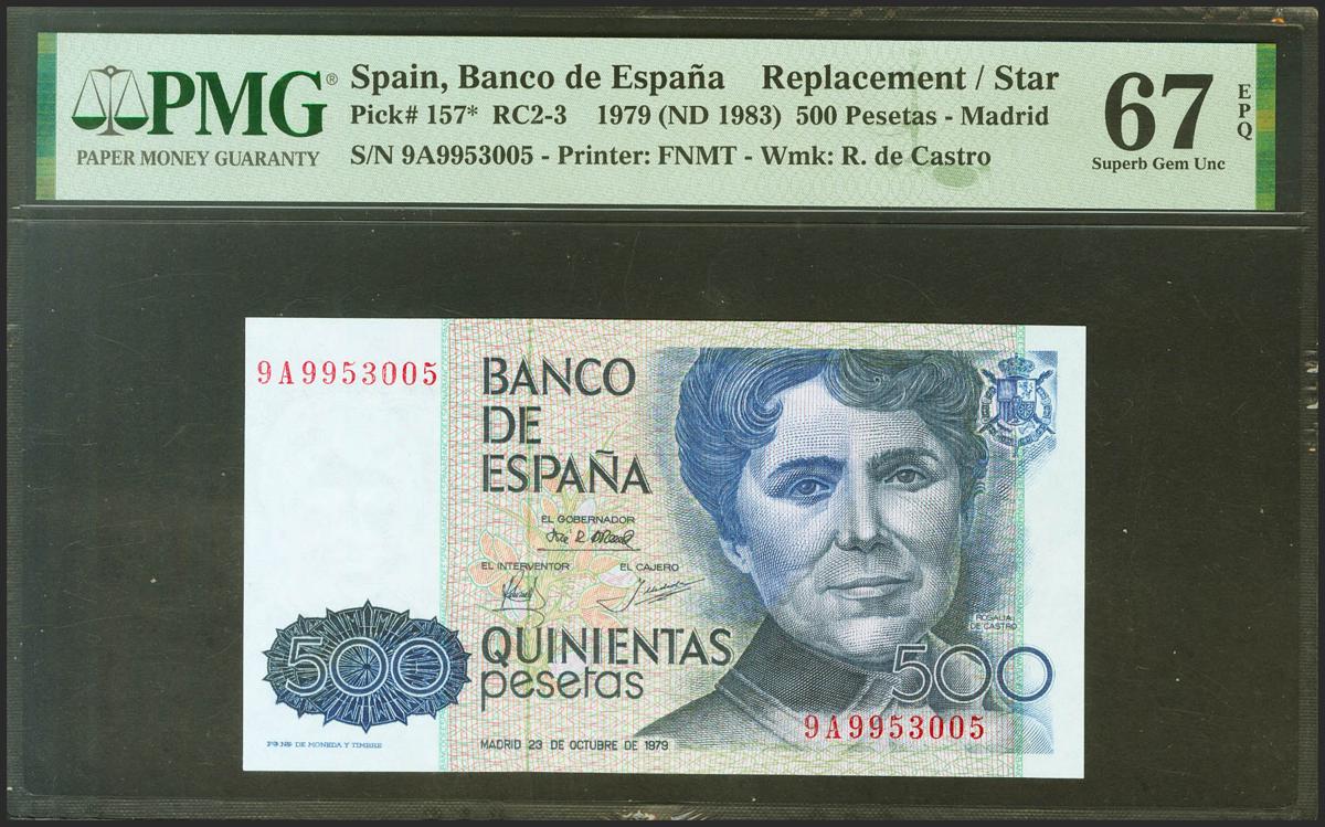 500 Pesetas. 23 de Octubre de 1979. Serie especial 9A. (Edifil 2021: 476b, Pick: 157*). Raro en esta excepcional calidad, apresto original. SC. Encapsulado PMG67EPQ.