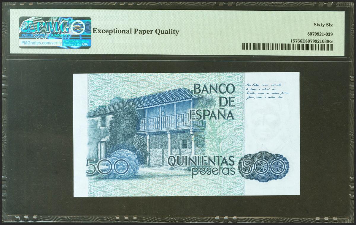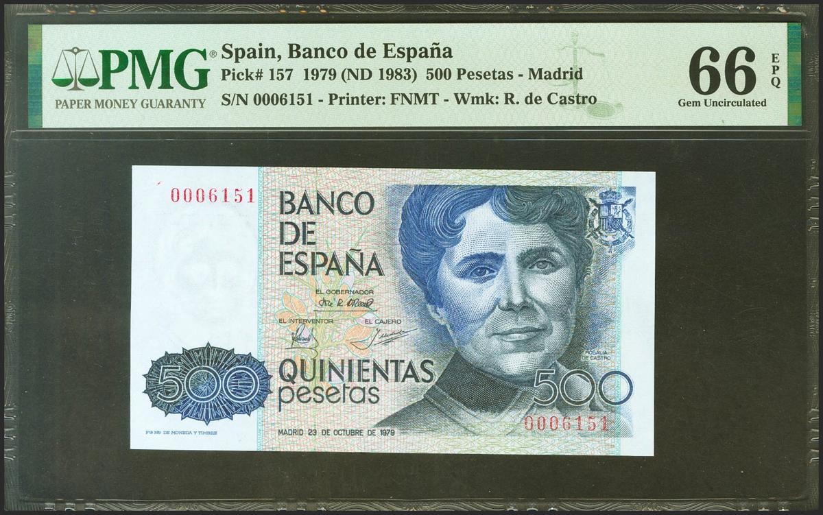 500 Pesetas. 23 de Octubre de 1979. Sin serie, numeración baja. (Edifil 2021: 476, Pick: 157). Inusual en esta excepcional calidad, apresto original. SC. Encapsulado PMG66EPQ.