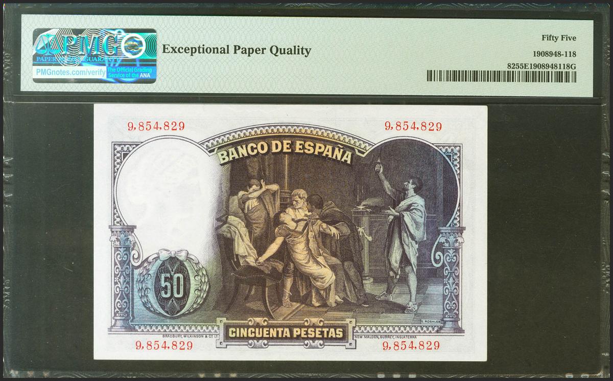 50 Pesetas. 25 de Abril de 1931. Sin serie. (Edifil 2021: 359, Pick: 82). Apresto original. EBC+. Encapsulado PMG55EPQ.