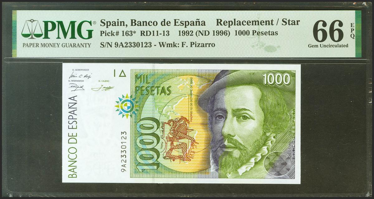1000 Pesetas. 12 de Octubre de 1992. Serie especial 9A. (Edifil 2021: 483c, Pick: 163*). Inusual en esta excepcional calidad, apresto original. SC. Encapsulado PMG66EPQ.