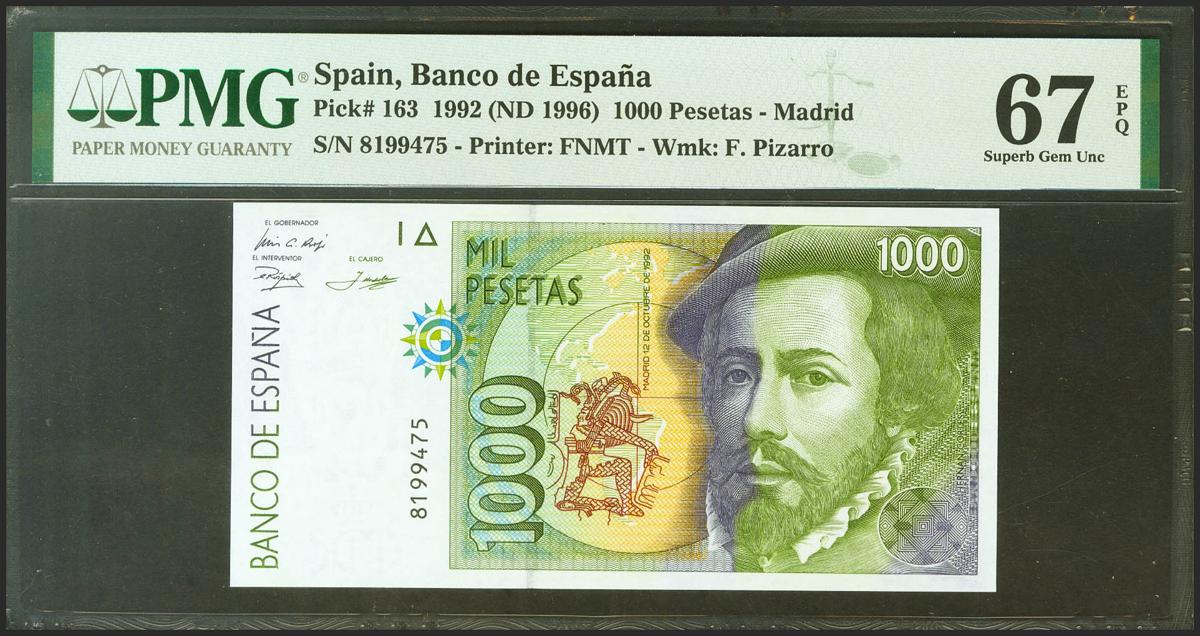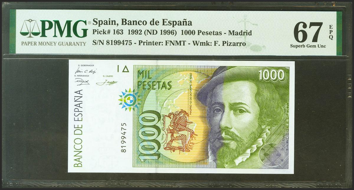 1000 Pesetas. 12 de Octubre de 1992. Sin serie. (Edifil 2021: 483, Pick: 163). Raro en esta excepcional calidad, apresto original. SC. Encapsulado PMG67EPQ.