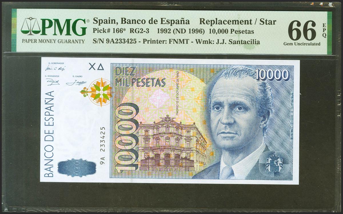 10000 Pesetas. 12 de Octubre de 1992. Serie especial 9A. (Edifil 2021: 485b, Pick: 166*). Inusual en esta excepcional calidad, apresto original. SC. Encapsulado PMG66EPQ.