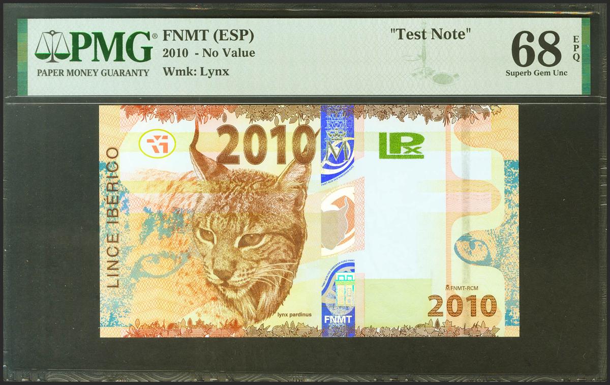 Prueba de billete de la FNMT, emitido en el 2010. No catalogado. Encapsulado PMG68EPQ. SC.