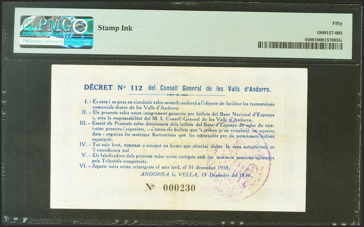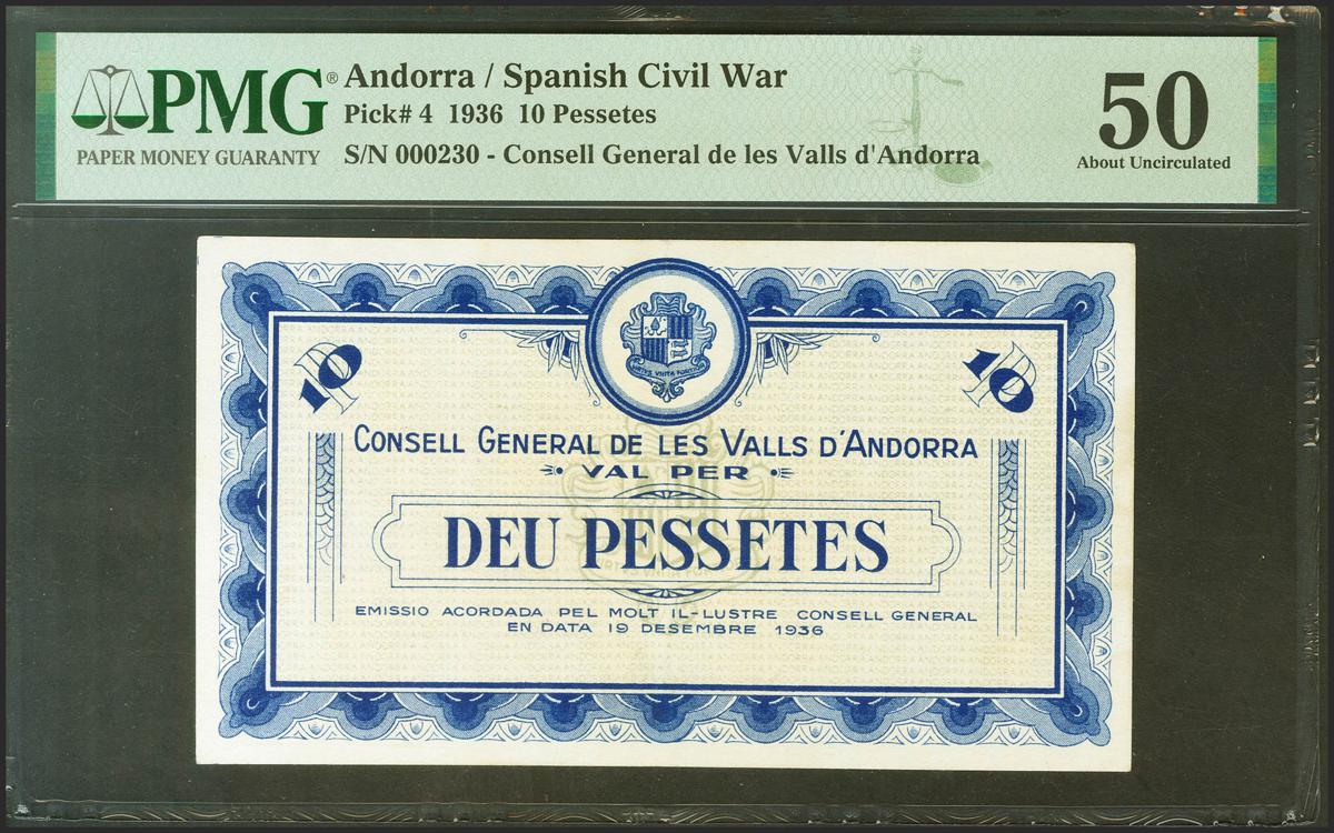 ANDORRA. 10 Pessetes. 19 de Diciembre de 1936. Sin serie y numeración baja. (Edifil 2021: 8, Pick: 4). Rarísimo en esta conservación. EBC. Encapsulado PMG50.
