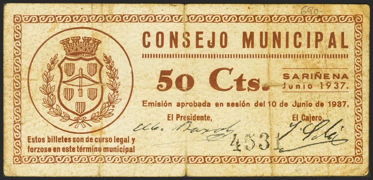 SARIÑENA (HUESCA). 50 Céntimos. 10 de Junio de 1937. (González: 4785). MBC.