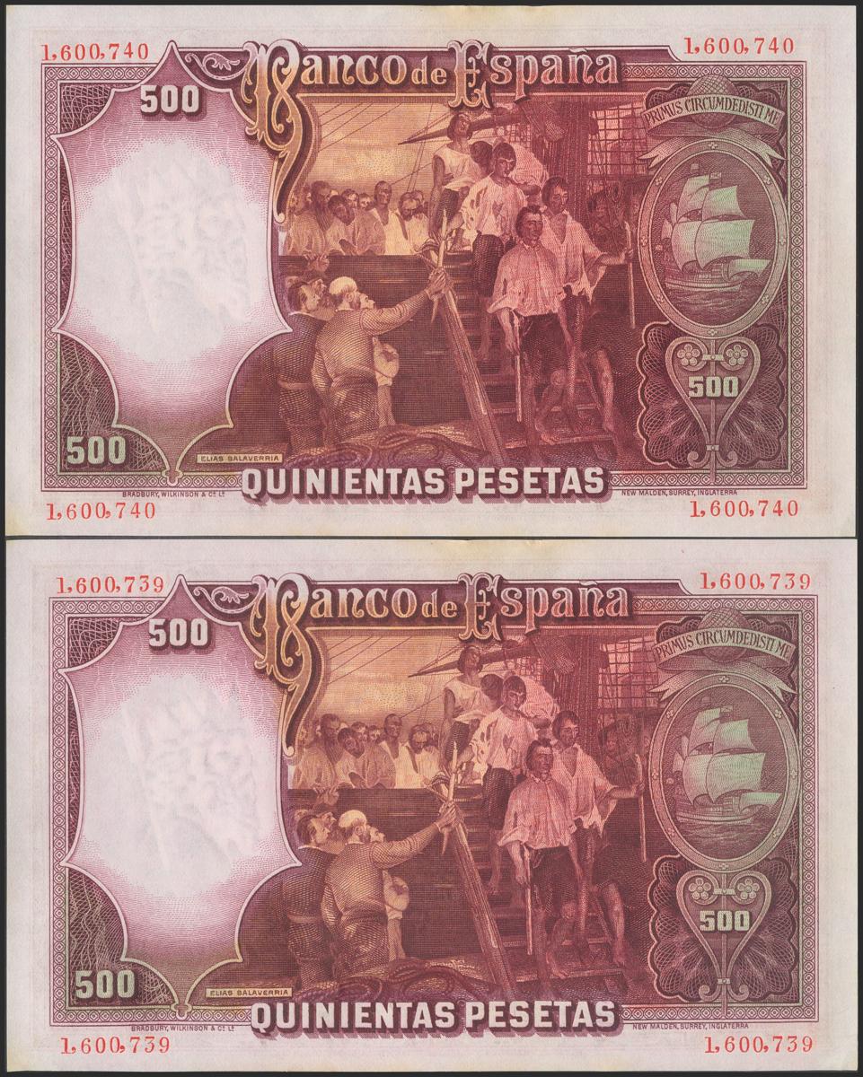 500 Pesetas. 25 de Abril de 1931. Pareja correlativa. Sin serie. (Edifil 2017: 361). Conserva todo el apresto original, manchita en el margen superior. EBC+.