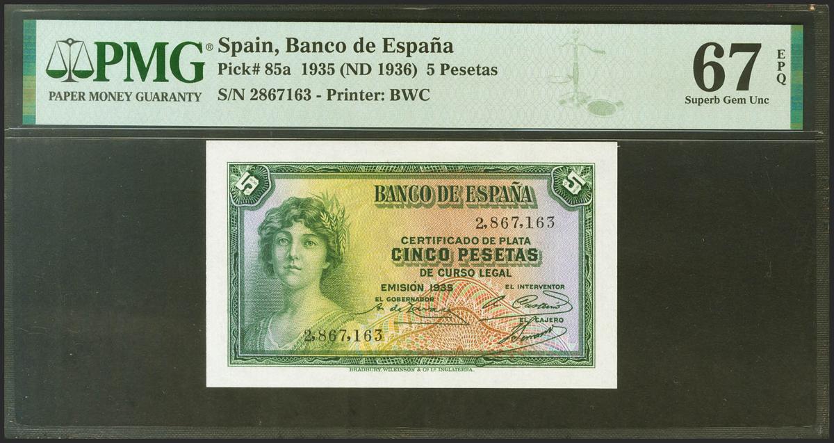 5 Pesetas. 1935. Certificado de Plata. Sin serie. (Edifil 2021: 363, Pick: 85a). Raro en esta conservación, apresto original. SC. Encapsulado PMG67EPQ.