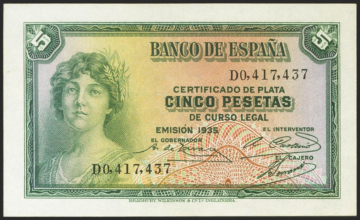 5 Pesetas. 1935. Certificado de Plata. Serie D. (Edifil 2021: 363a). Conserva todo su apresto original. SC.
