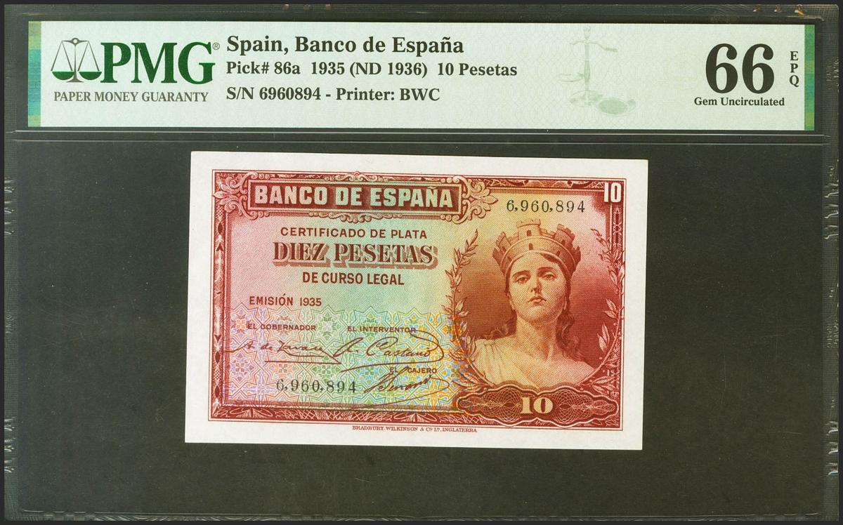 10 Pesetas. 1935. Certificado de Plata. Sin serie. (Edifil 2021: 364, Pick: 86a). Inusual en esta excepcional calidad, apresto original. SC. Encapsulado PMG66EPQ.