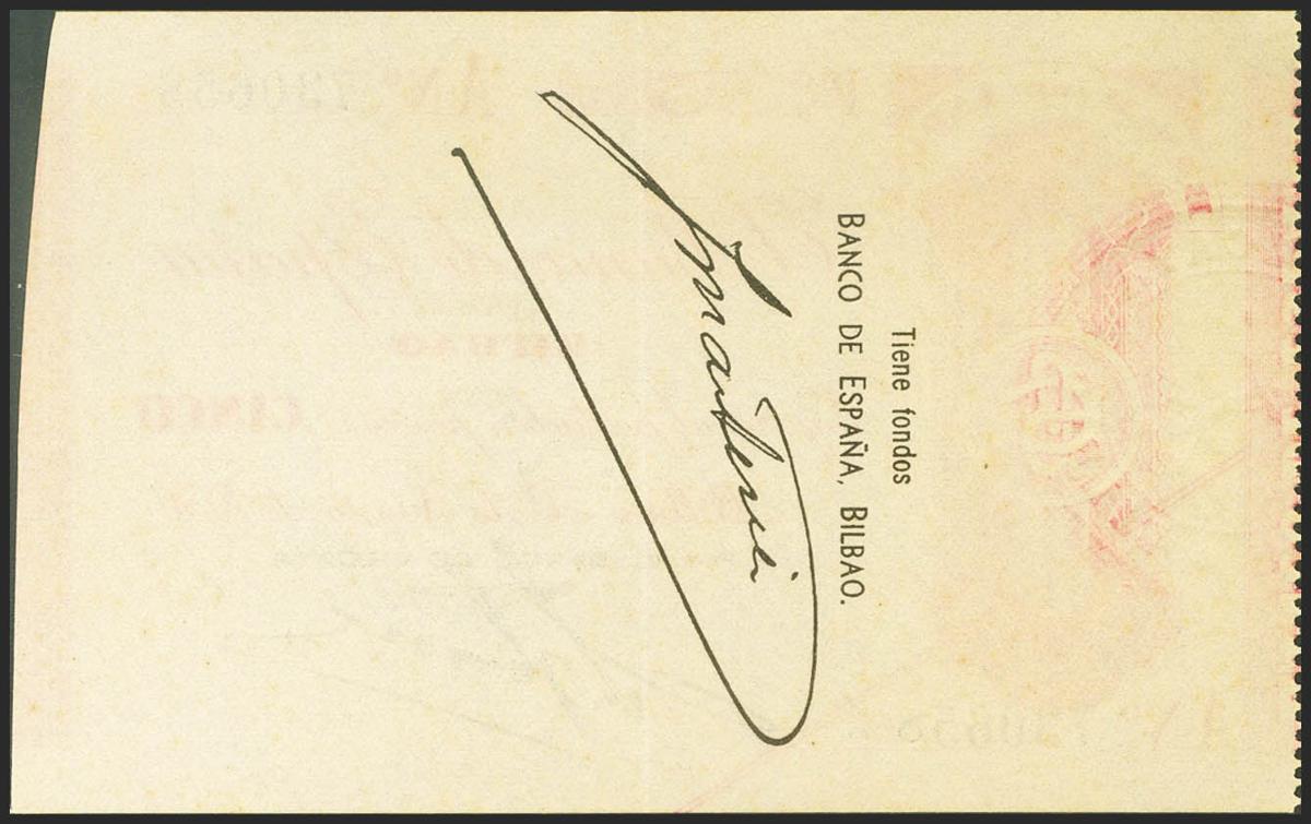 5 Pesetas. 30 de Agosto de 1936. Sucursal de Bilbao, antefirma del Banco de Vizcaya. Serie A. (Edifil 2021: 368Aa). Inusual, apresto original. EBC+.