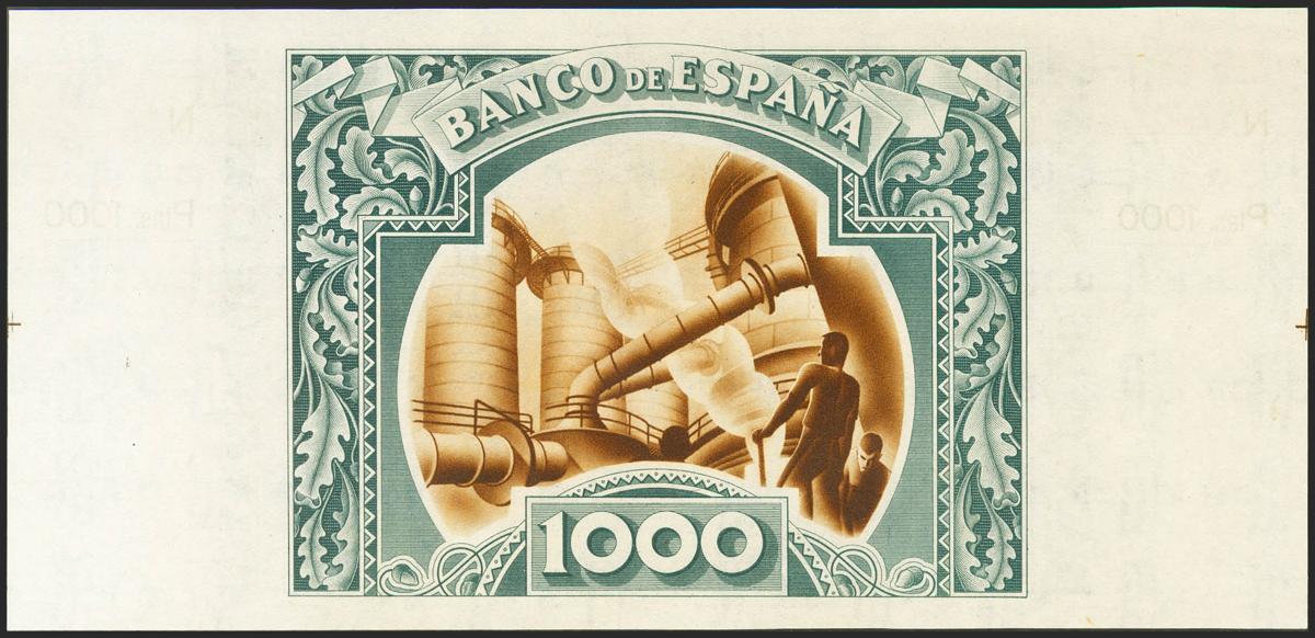 1000 Pesetas. 1 de Enero de 1937. Sucursal de Bilbao, antefirma Banco de Bilbao. No emitido, sin serie y sin numeración, con ambas matrices. (Edifil 2021: NE27a). Apresto original. SC-.