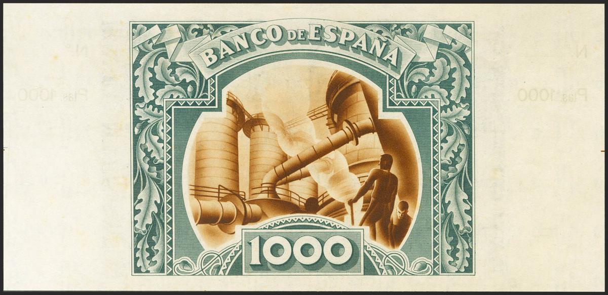 1000 Pesetas. 1 de Enero de 1937. Sucursal de Bilbao, antefirma Urquijo Vascongado. No emitido, sin serie y sin numeración, con ambas matrices. (Edifil 2021: NE27f). Apresto original, típicos puntitos del tiempo. EBC+.