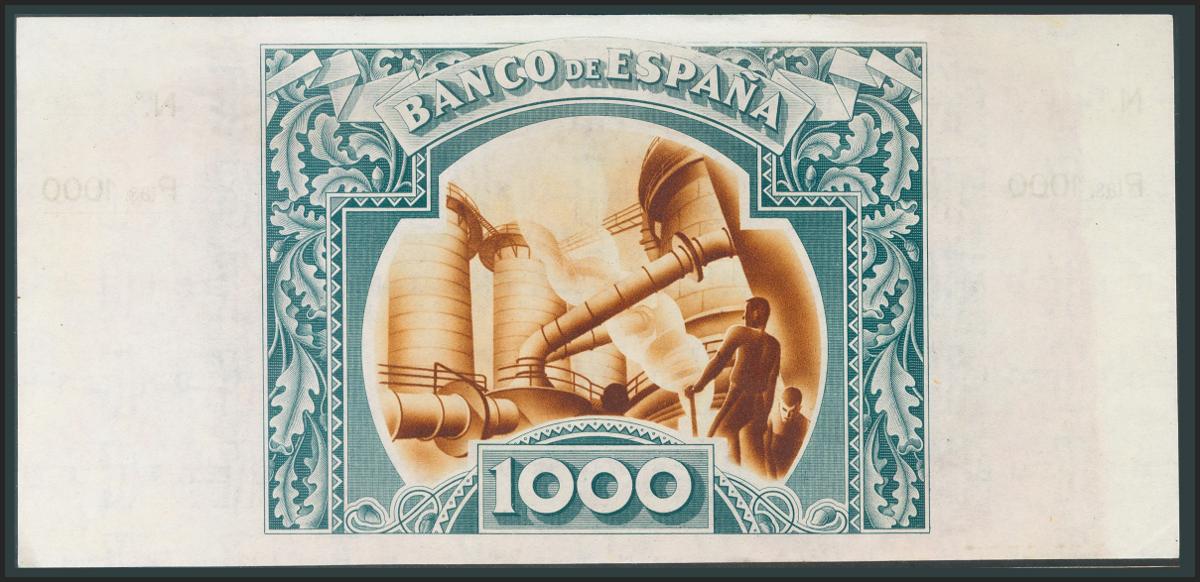 1000 Pesetas. 1 de Enero de 1937. No Emitido. Sucursal de Bilbao, antefirma Banco de Vizcaya. Sin serie y sin numeración, con ambas matrices. (Edifil 2017: NE27g). Reparado en el margen superior. EBC.
