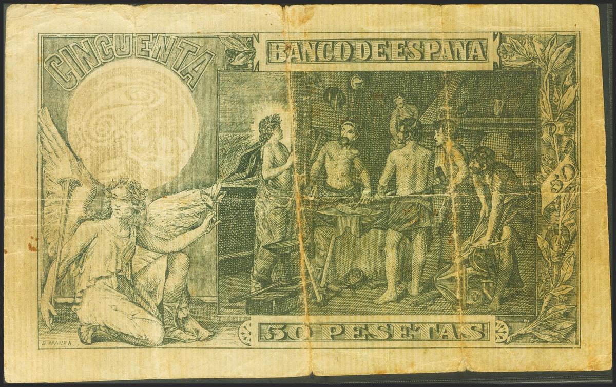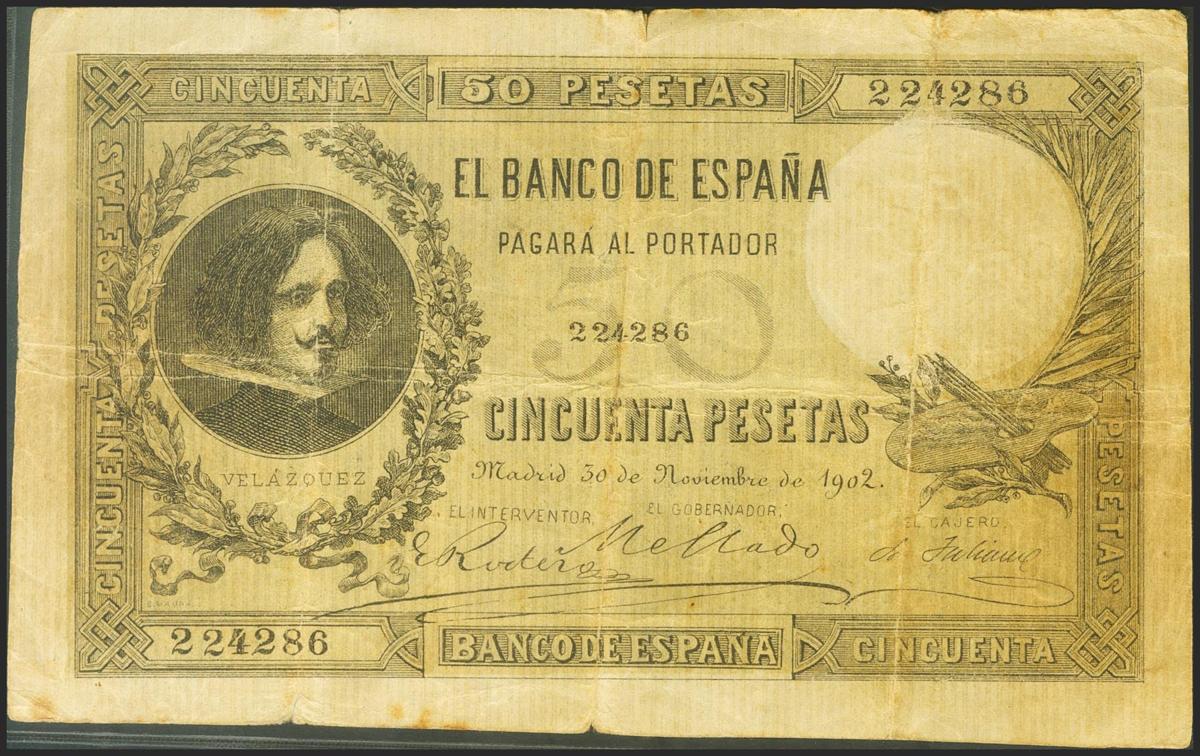 50 Pesetas. 30 de Noviembre de 1902. Falso de Epoca. Sin serie. (Edifil 2021: 309F). Rarísimo, pieza de enorme interés. MBC-.