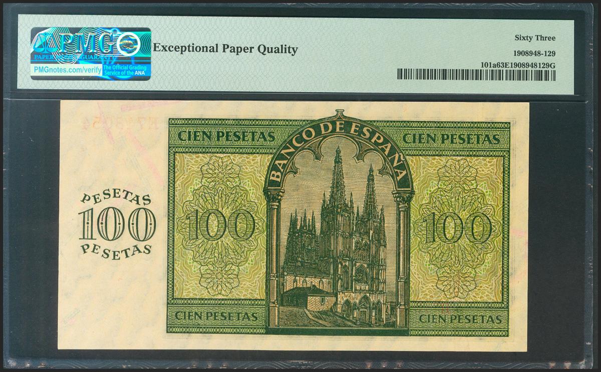 100 Pesetas. 21 de Noviembre de 1936. Serie E. (Edifil 2021: 421a, Pick: 101a). Inusual en esta calidad, apresto original. SC. Encapsulado PMG63EPQ.