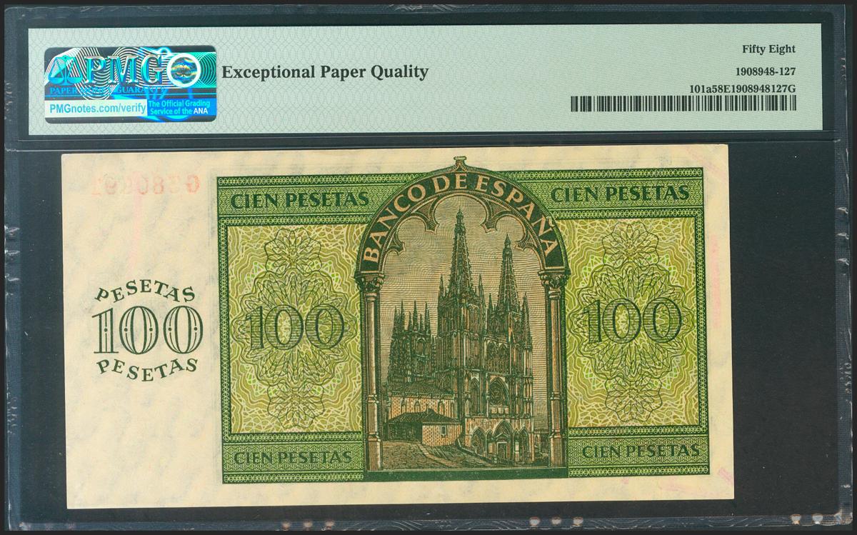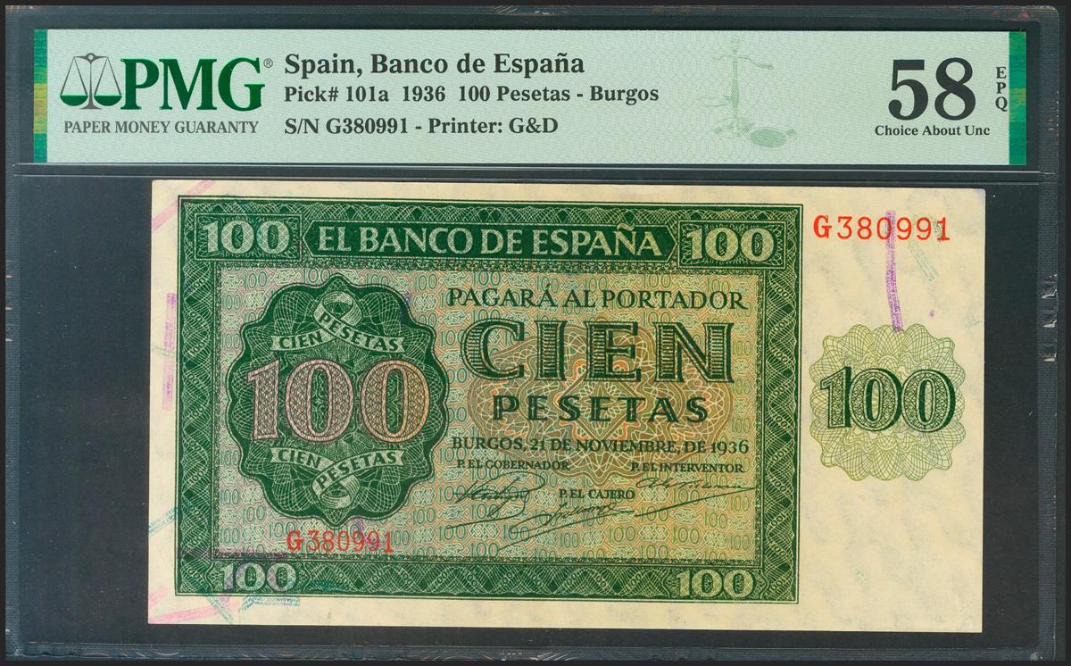 100 Pesetas. 21 de Noviembre de 1936. Serie G. (Edifil 2021: 421a, Pick: 101a). Apresto original. EBC+++. Encapsulado PMG58EPQ.