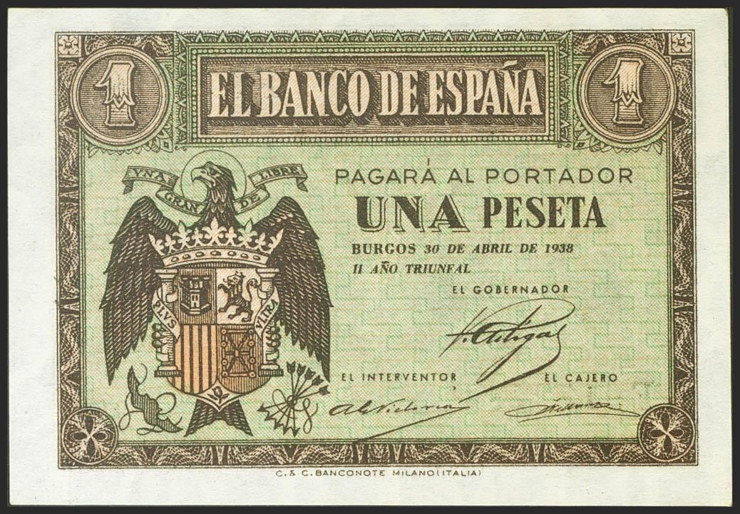 1 Peseta. 30 de Abril de 1938. Serie F. (Edifil 2021: 428a). Apresto original. SC.