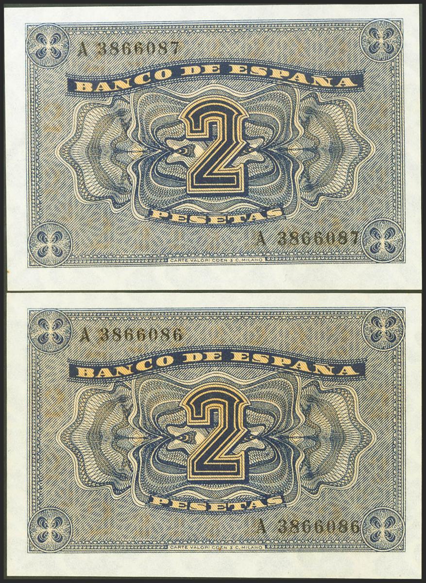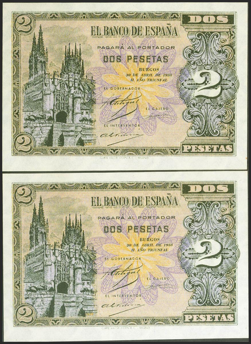 2 Pesetas. 30 de Abril de 1938. Pareja correlativa. Serie A. (Edifil 2021: 429). Conserva todo su apresto original. SC.