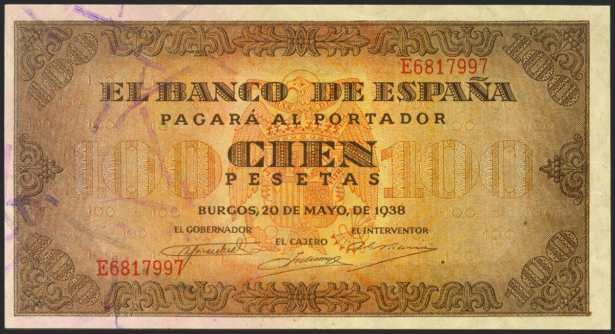 100 Pesetas. 20 de Mayo de 1938. Serie E. (Edifil 2021: 432a). Conserva gran parte de su apresto original. EBC+.