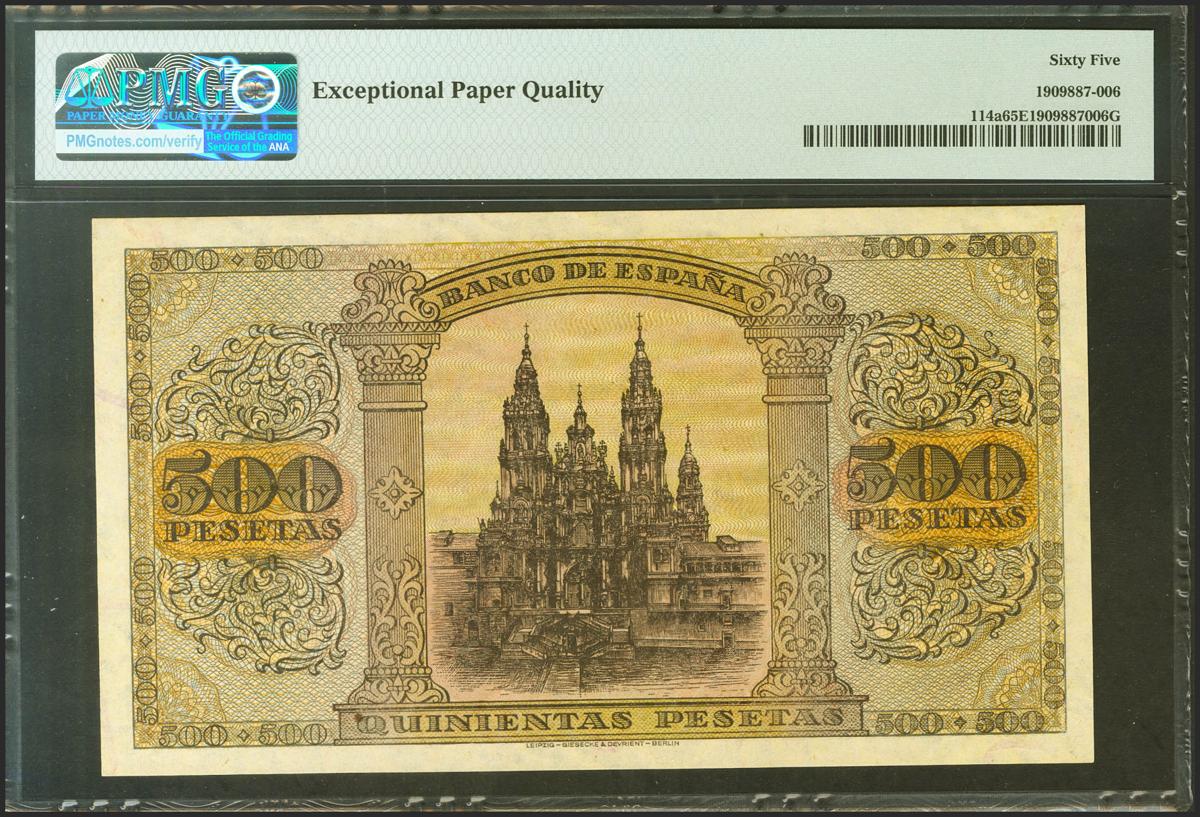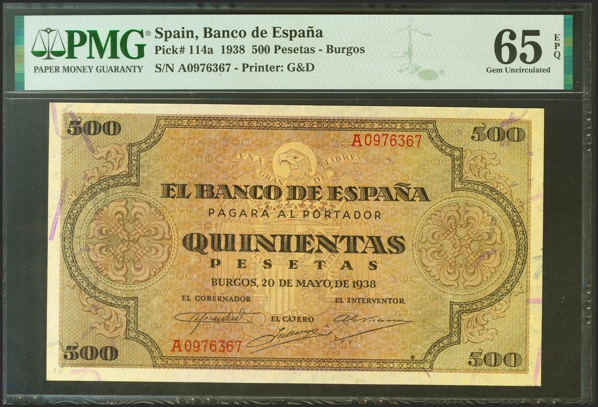 500 Pesetas. 20 de Mayo de 1938. Serie A. (Edifil 2021: 433, Pick: 114a). Rarísimo en esta excepcional calidad, apresto original. SC. Encapsulado PMG65EPQ.