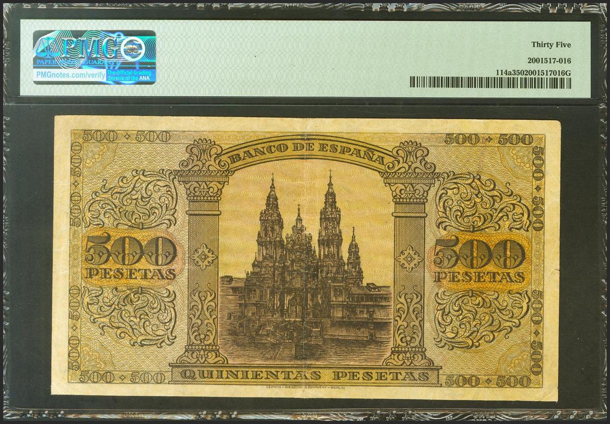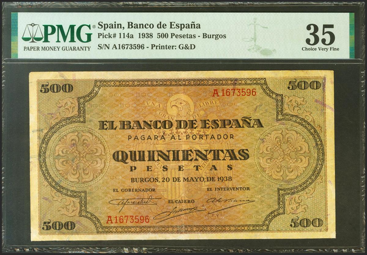 500 Pesetas. 20 de Mayo de 1938. Serie A. (Edifil 2021: 433, Pick: 114a). EBC-. Encapsulado PMG35.