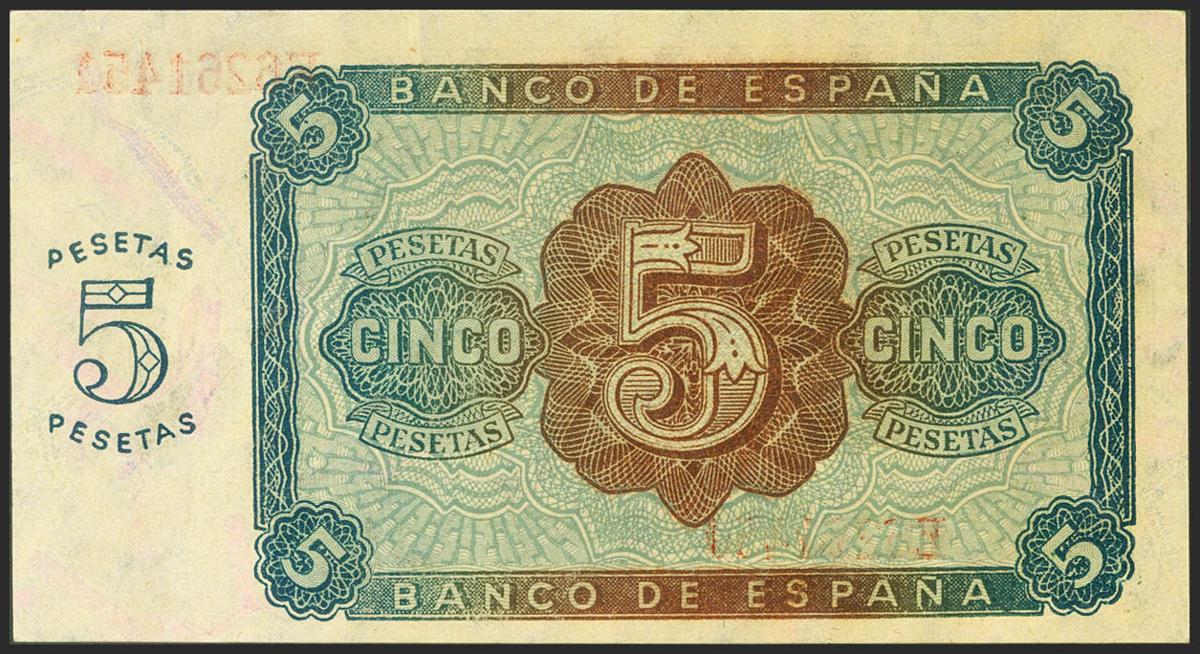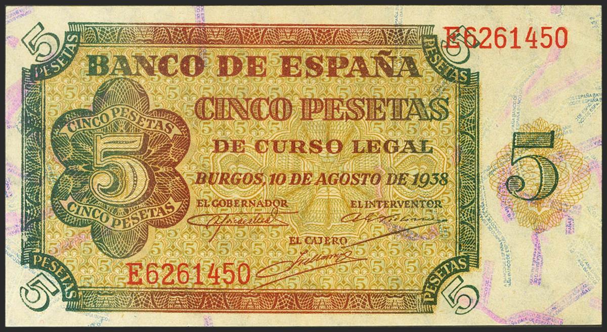 5 Pesetas. 10 de Agosto de 1938. Serie E. (Edifil 2021: 435a). Apresto original. SC.