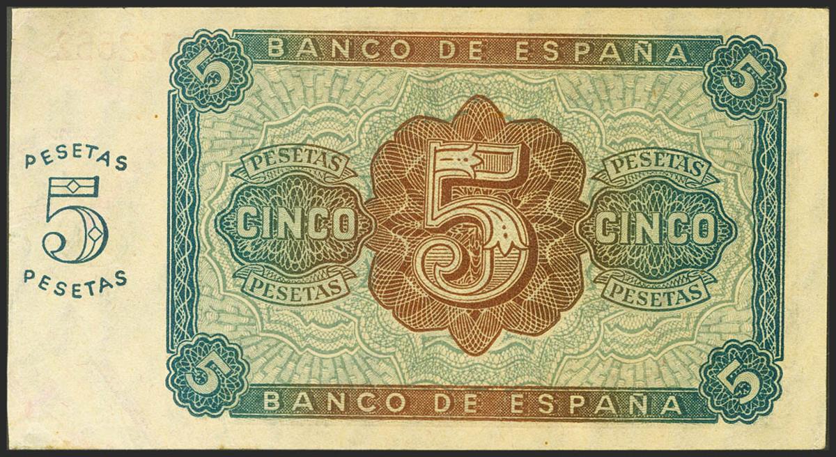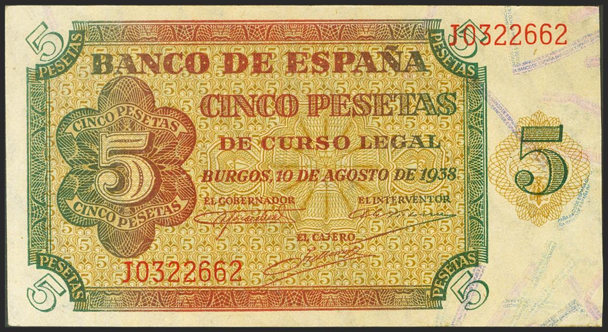 5 Pesetas. 10 de Agosto de 1938. Serie J. (Edifil 2021: 435a). Apresto original. SC-.