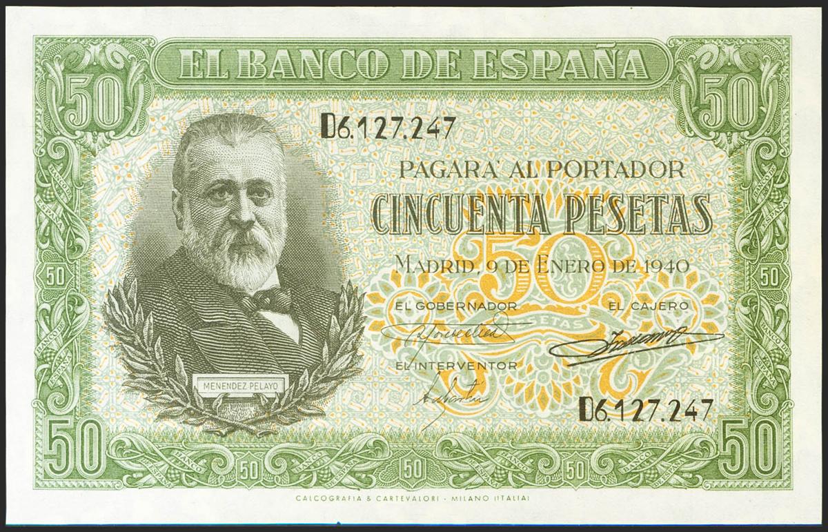 50 Pesetas. 9 de Enero de 1940. Serie D. (Edifil 2021: 437a). Conserva gran parte de su apresto original. EBC+.