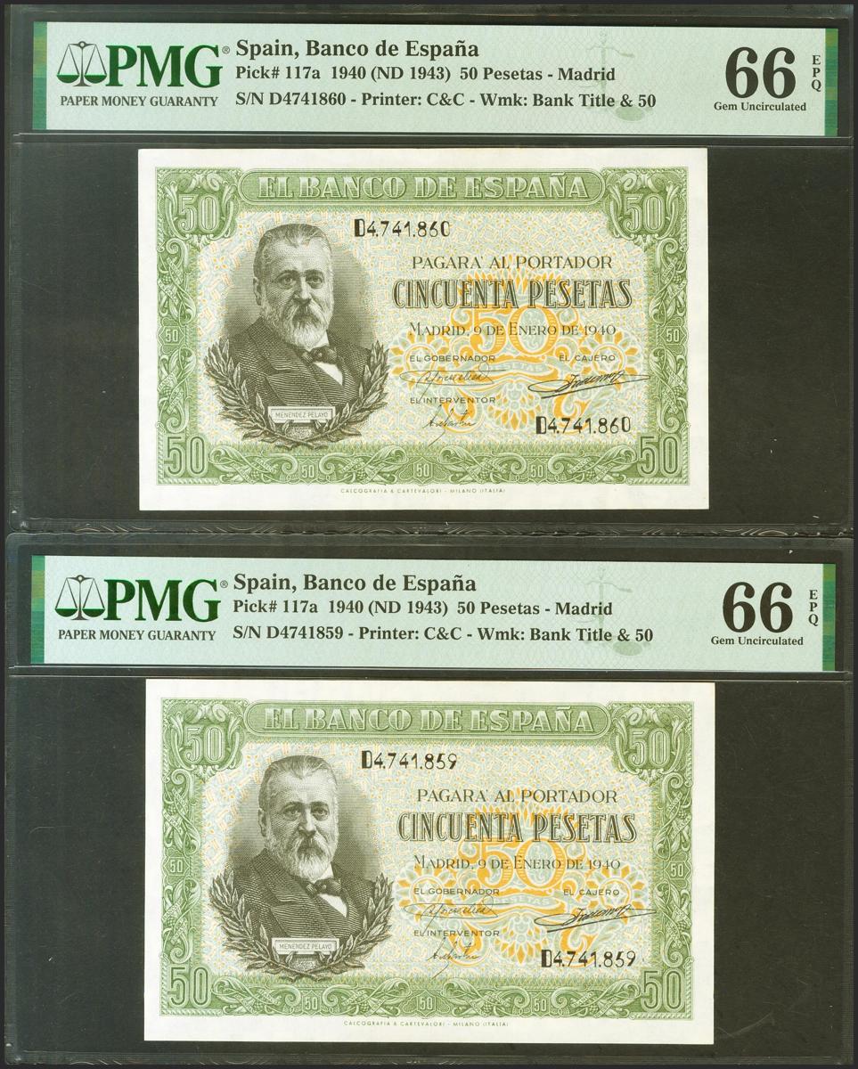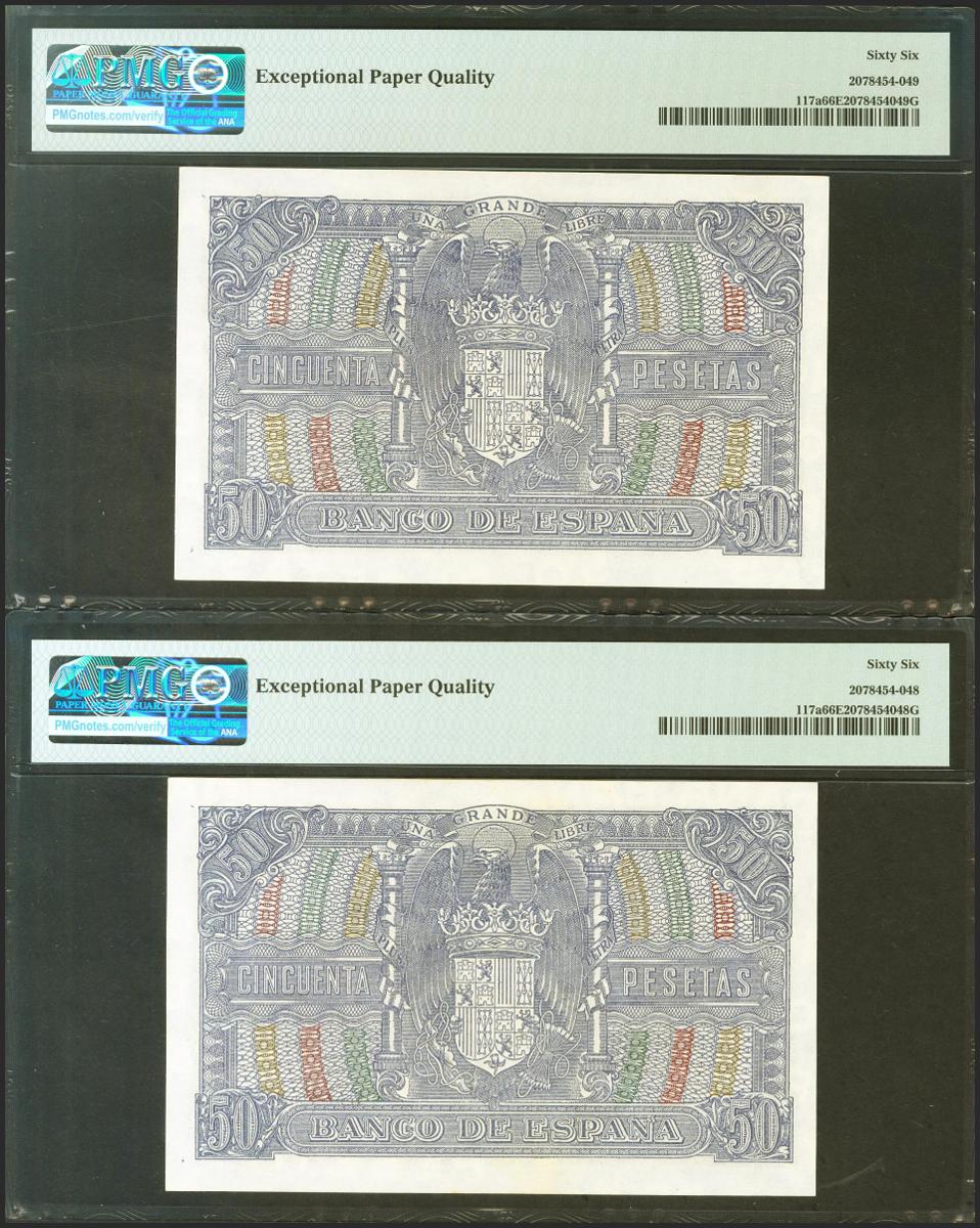 50 Pesetas. 9 de Enero de 1940. Pareja correlativa. Serie D. (Edifil 2021: 437a, Pick: 117a). Rara pareja en esta excepcional calidad, apresto original. SC. Encapsulados PMG66EPQ, ambos.