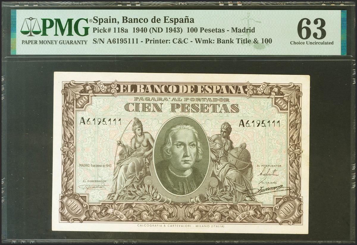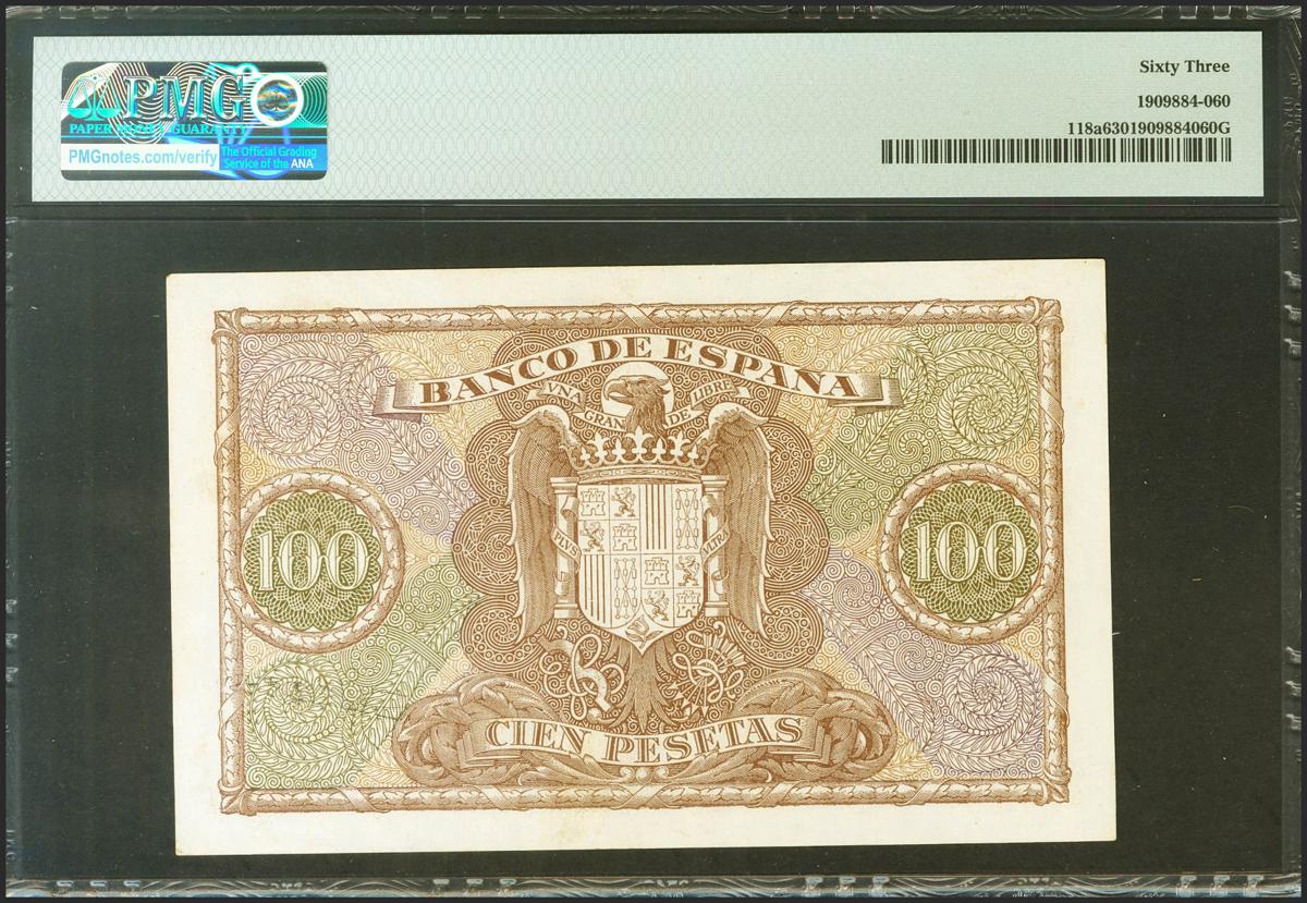 100 Pesetas. 9 de Enero de 1940. Serie A. (Edifil 2021: 438, Pick: 118a). Inusual en esta calidad. SC. Encapsulado PMG63.
