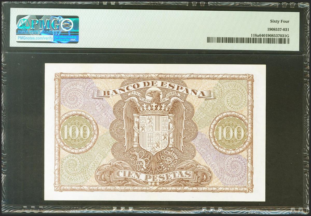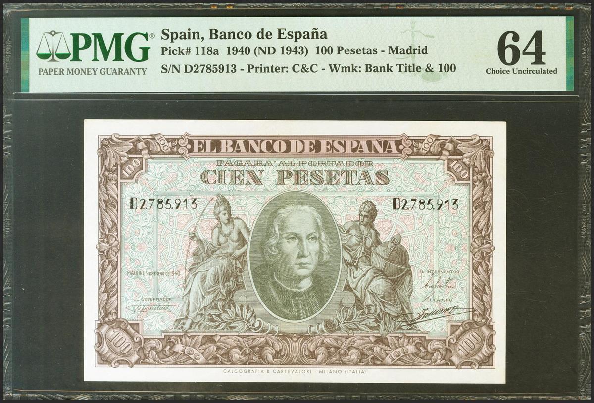 100 Pesetas. 9 de Enero de 1940. Serie D. (Edifil 2021: 438a, Pick: 118a). Inusual. SC. Encapsulado PMG64.