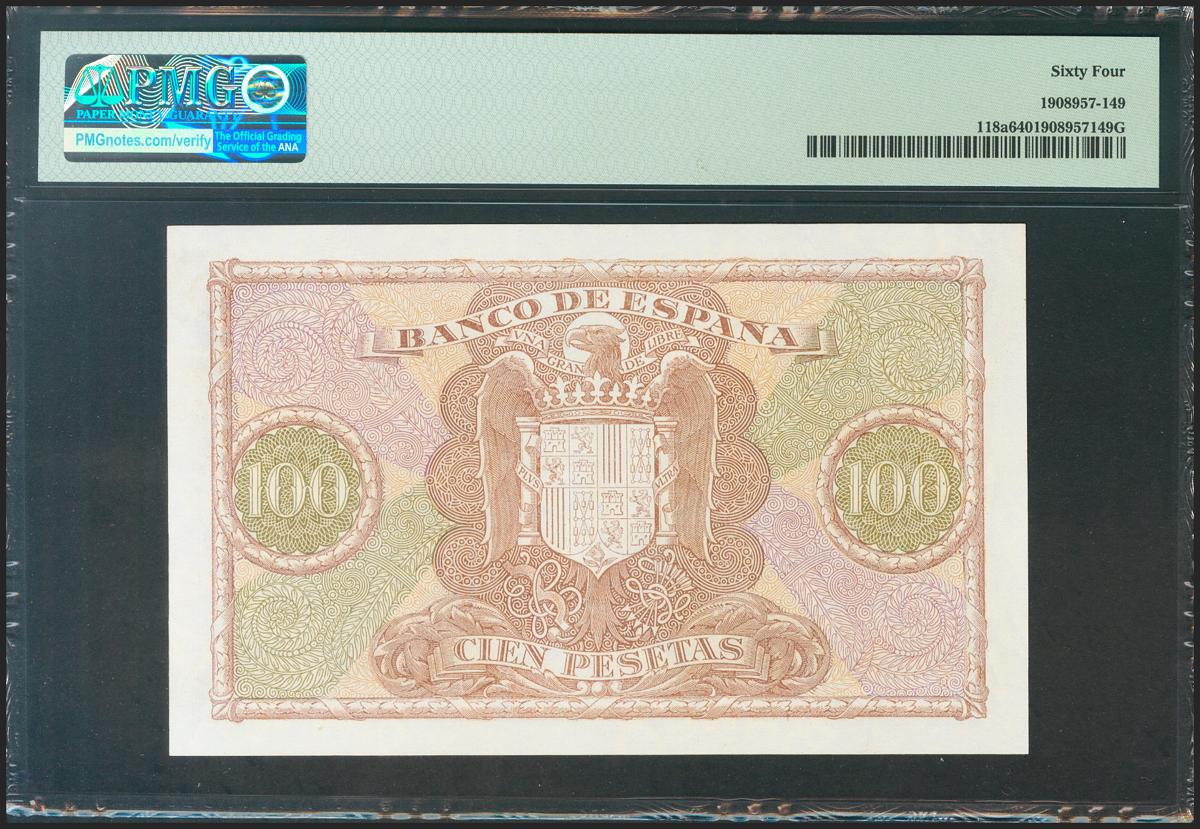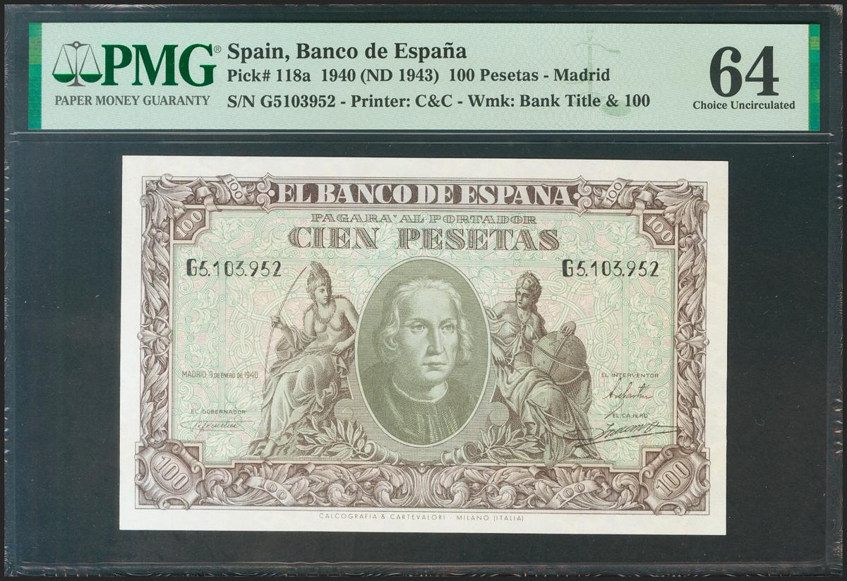 100 Pesetas. 9 de Enero de 1940. Serie G. (Edifil 2021: 438a, Pick: 118a). Inusual en esta calidad. SC. Encapsulado PMG64.