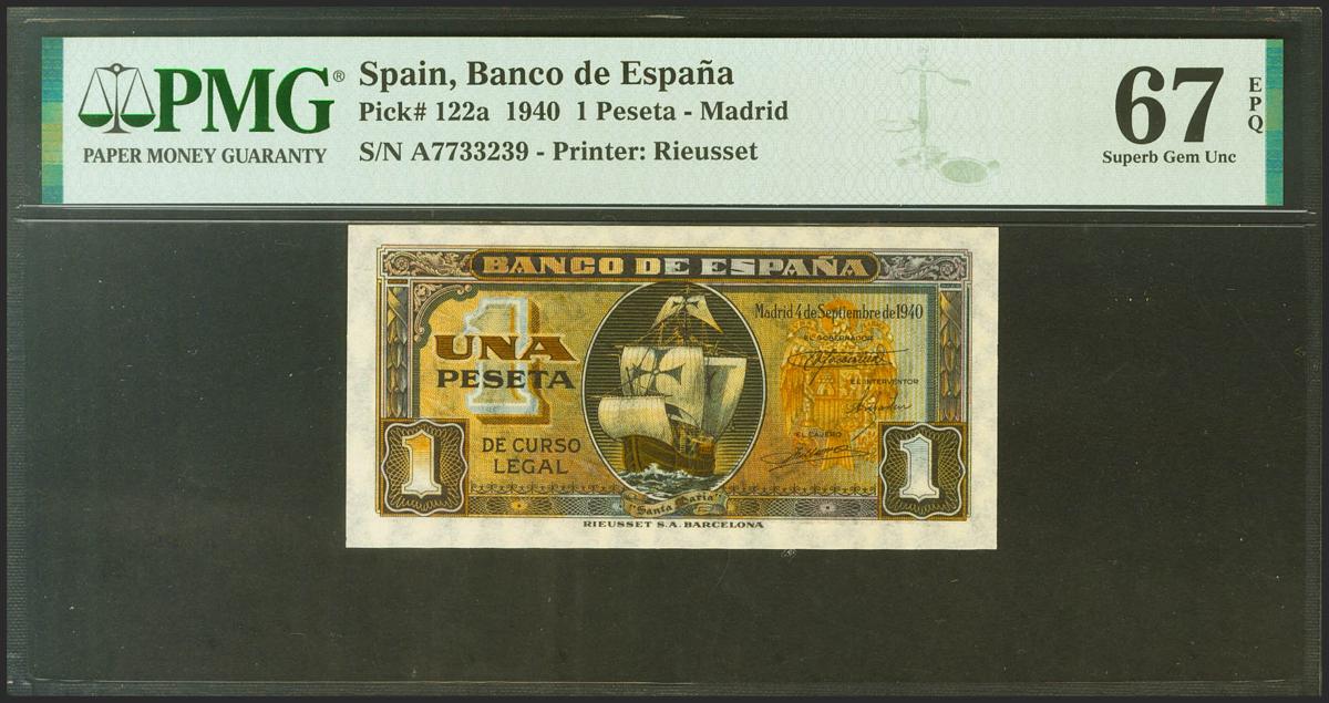 1 Peseta. 4 de Septiembre de 1940. Serie A. (Edifil 2021: 442a, Pick: 122a). Raro en esta conservación, apresto original. SC. Encapsulado PMG67EPQ.