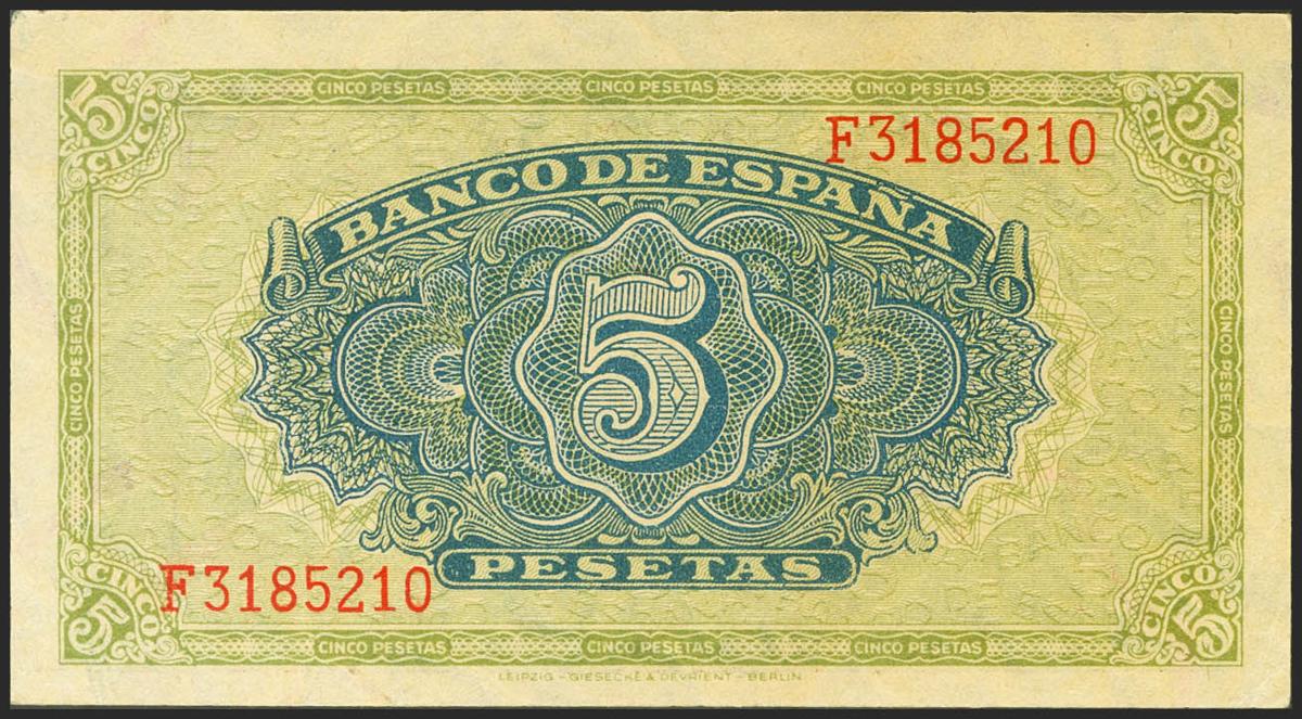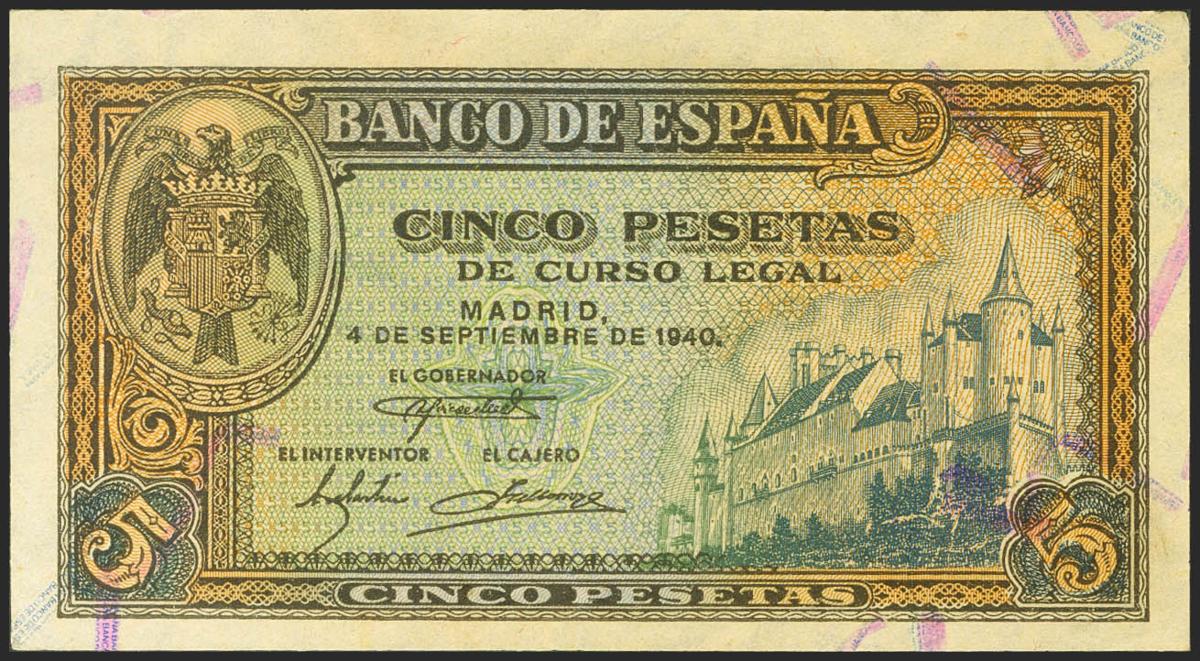 5 Pesetas. 4 de Septiembre de 1940. Serie F. (Edifil 2021: 443a). Conserva todo su apresto original. SC-.