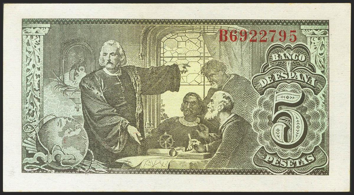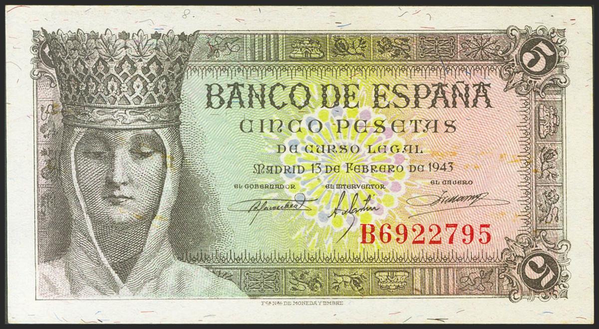 5 Pesetas. 13 de Febrero de 1943. Serie B. (Edifil 2021: 446a). Conserva gran parte de su apresto original. EBC++.
