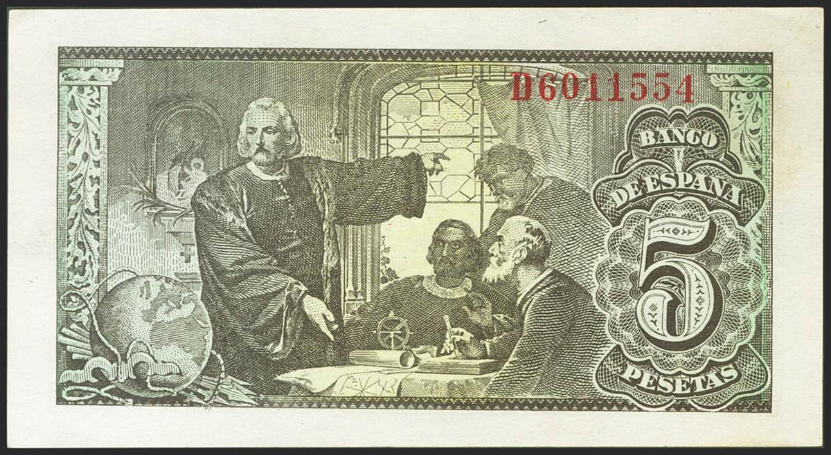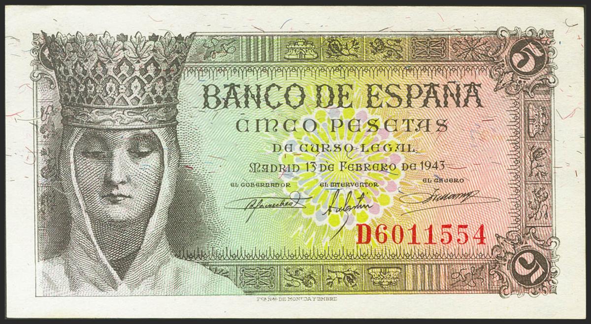 5 Pesetas. 13 de Febrero de 1943. Serie D. (Edifil 2021: 446a). Conserva gran parte de su apresto original. EBC++.
