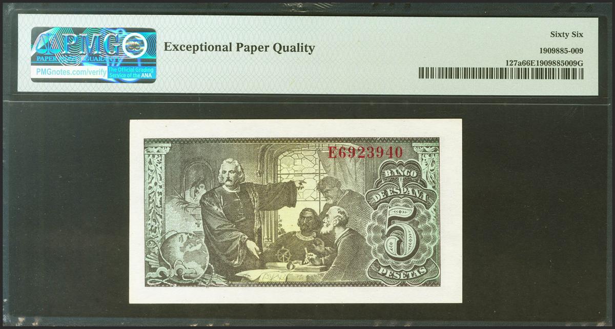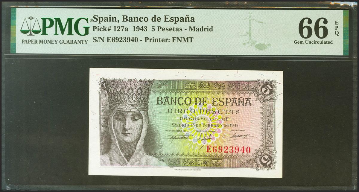 5 Pesetas. 13 de Febrero de 1943. Serie E. (Edifil 2021: 446a, Pick: 127a). Raro en esta excepcional calidad, apresto original. SC. Encapsulado PMG66EPQ.