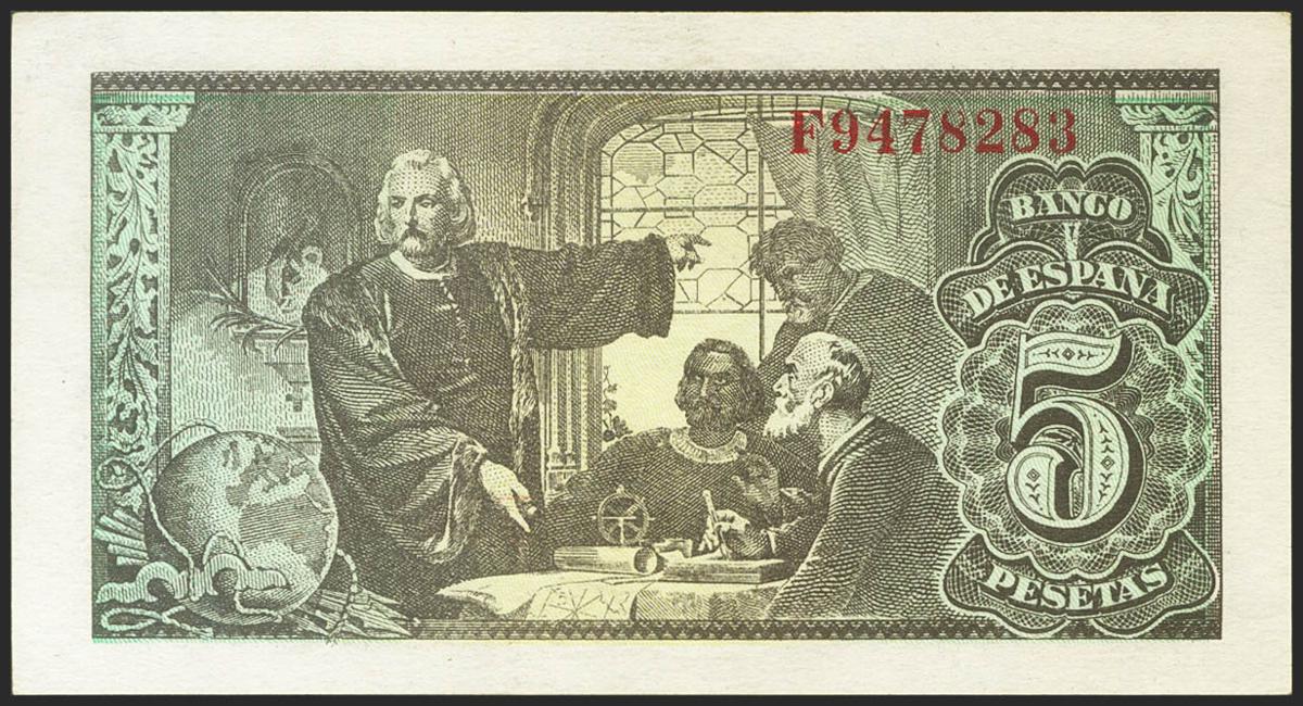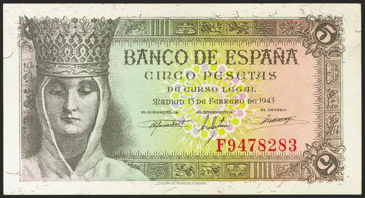 5 Pesetas. 13 de Febrero de 1943. Serie F. (Edifil 2021: 446a). Apresto original. SC-.