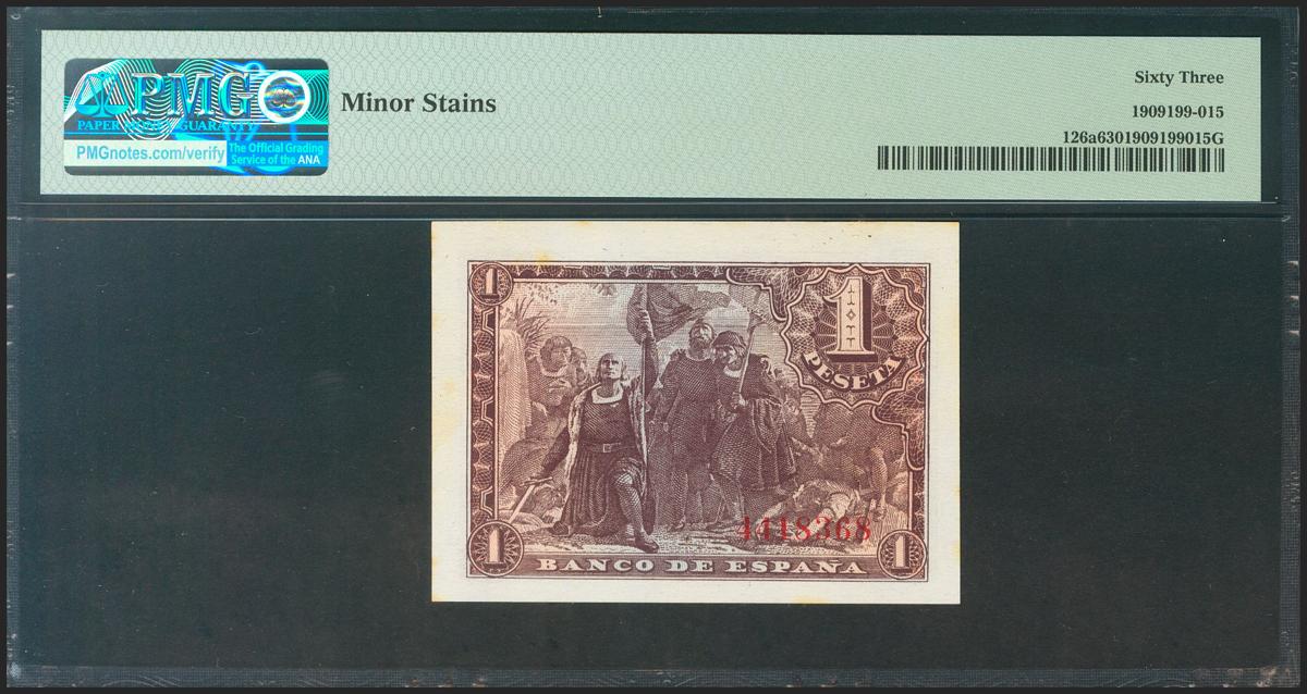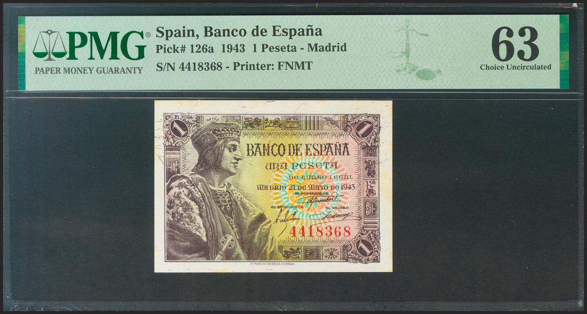 1 Pesetas. 21 de Mayo de 1943. Sin serie. (Edifil 2021: 447, Pick: 126a). Inusual. SC. Encapsulado PMG63.