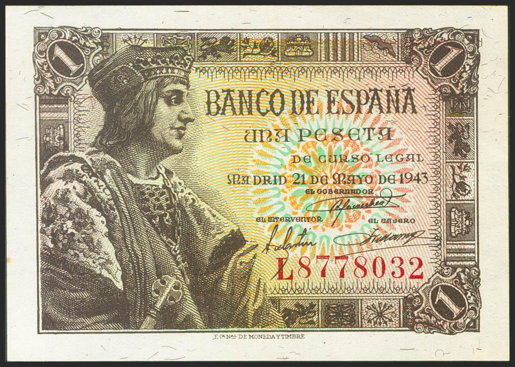 1 Peseta. 21 de Mayo de 1943. Serie L. (Edifil 2021: 447a). Apresto original. SC-.