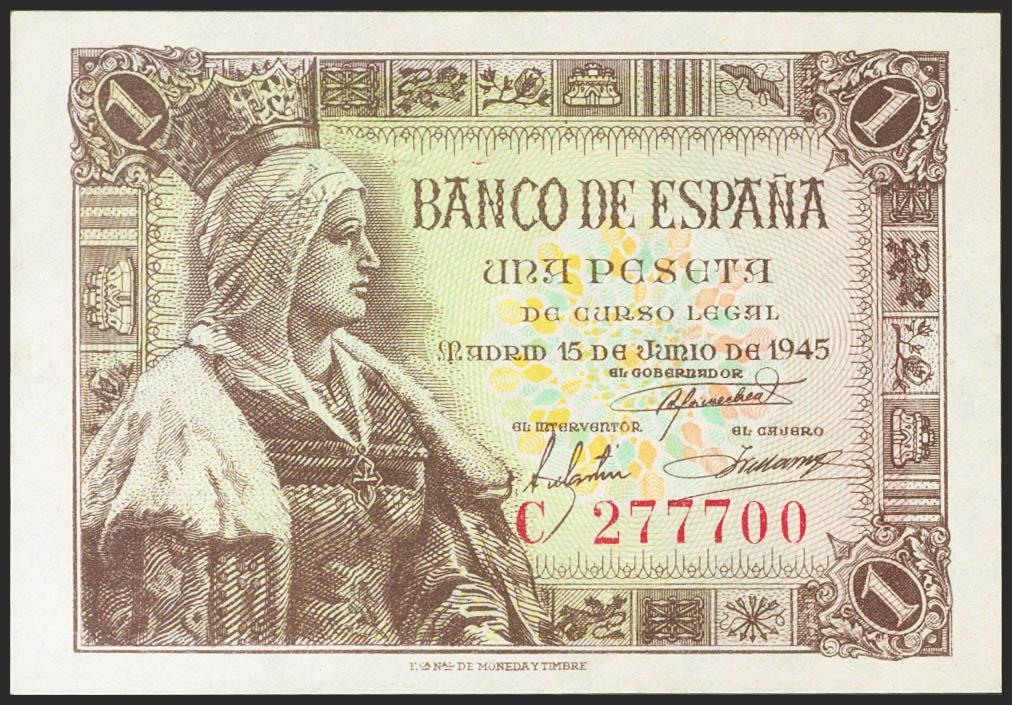 1 Peseta. 15 de Junio de 1945. Serie C. (Edifil 2021: 448a). Apresto original. SC.