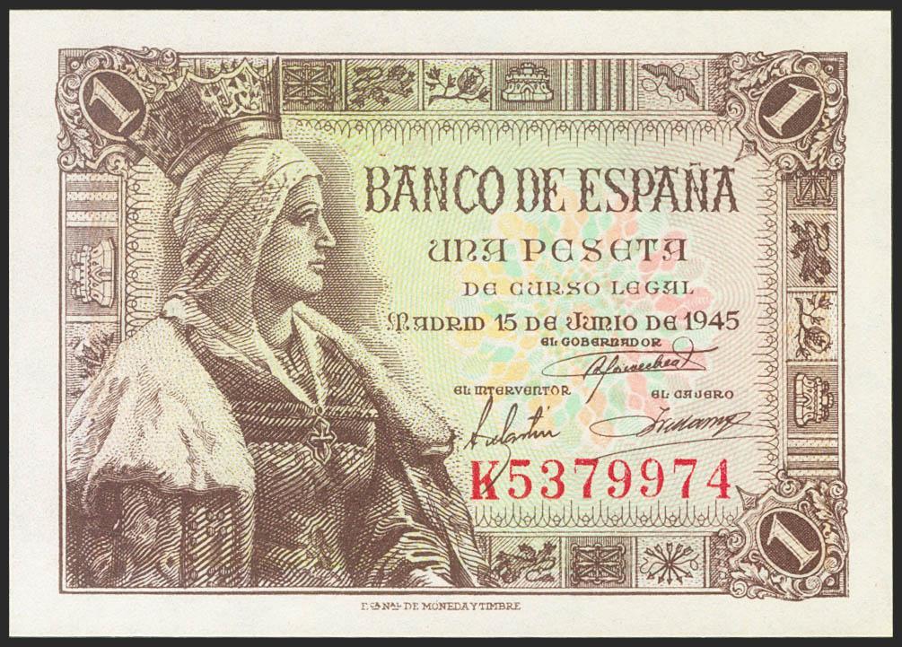 1 Peseta. 15 de Junio de 1945. Serie K. (Edifil 2021: 448a). Apresto original. SC.