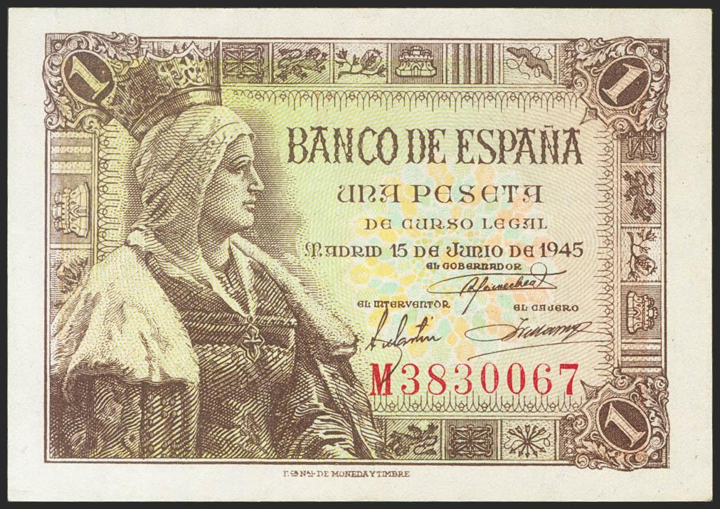1 Peseta. 15 de Junio de 1945. Serie M. (Edifil 2021: 448a). Apresto original. EBC++.