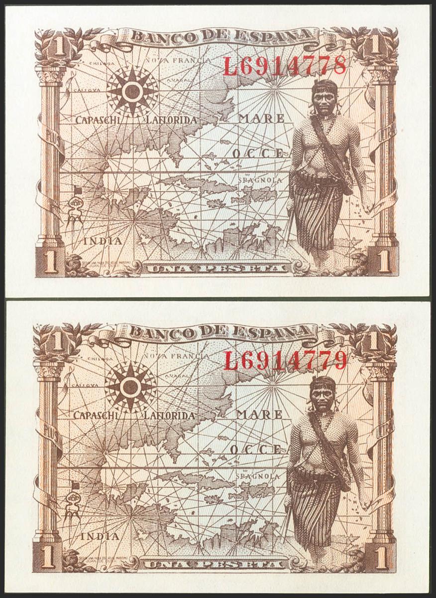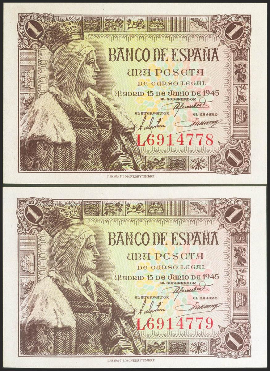 1 Peseta. 15 de Junio de 1945. Pareja correlativa. Serie L. (Edifil 2021: 448a). Apresto original. SC.
