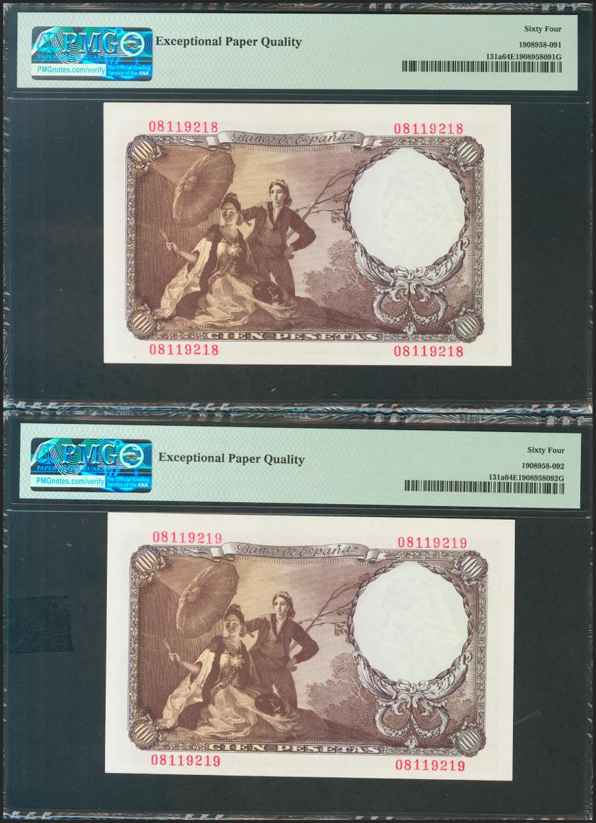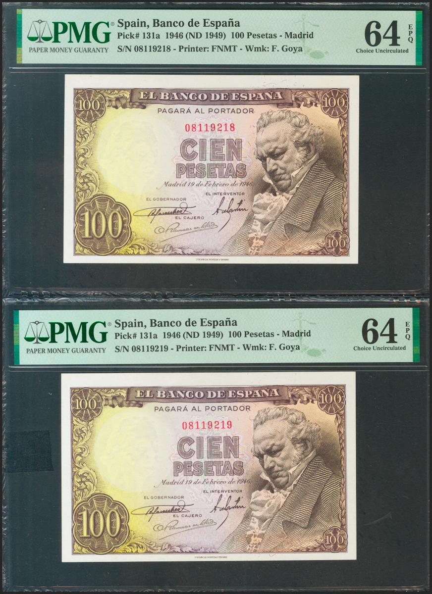 100 Pesetas. 19 de Febrero de 1946. Pareja correlativa. Sin serie. (Edifil 2021: 451, Pick: 131a). Inusual en esta calidad, apresto original. SC. Encapsulado PMG64EPQ, ambos.