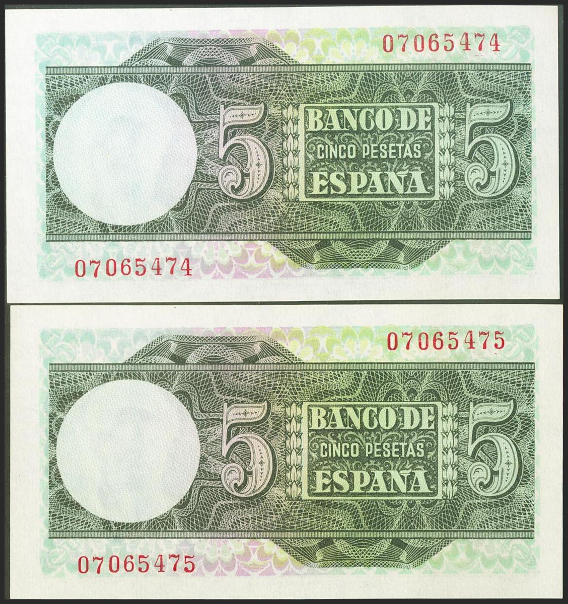 5 Pesetas. 15 de Marzo de 1948. Pareja correlativa. Sin serie. (Edifil 2021: 455). Apresto original. SC.