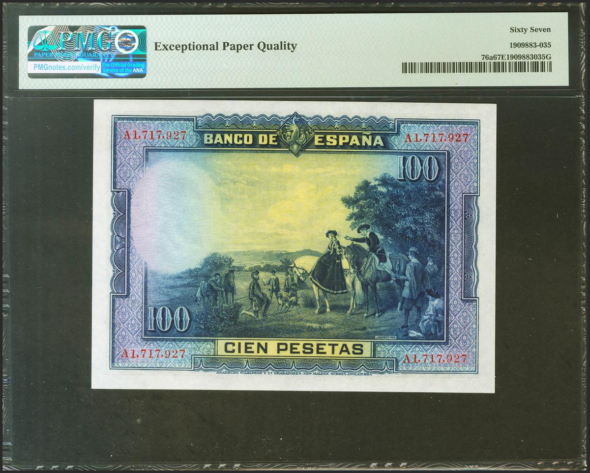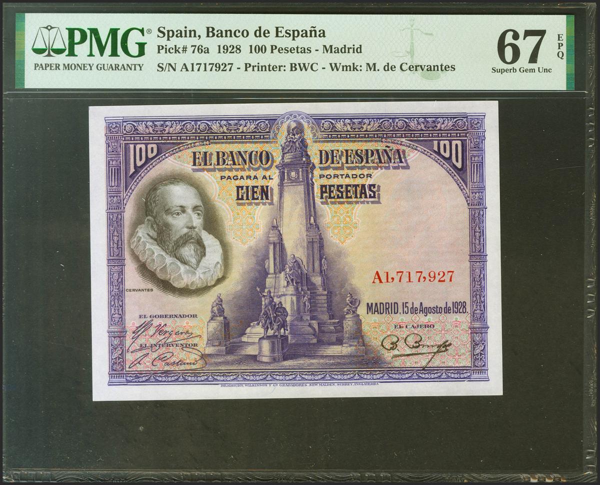100 Pesetas. 15 de Agosto de 1928. Serie A. (Edifil 2021: 355a, Pick: 76a). Raro en esta excepcional calidad, apresto original. SC. Encapsulado PMG67EPQ.
