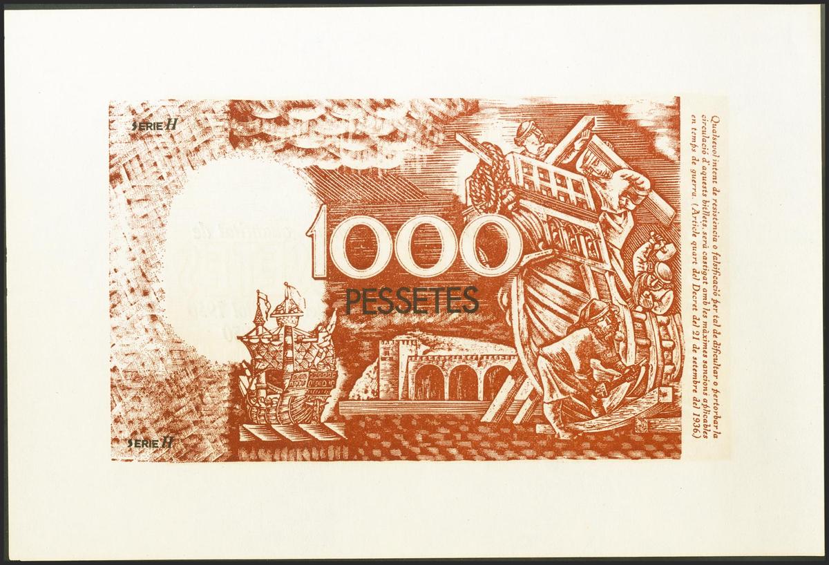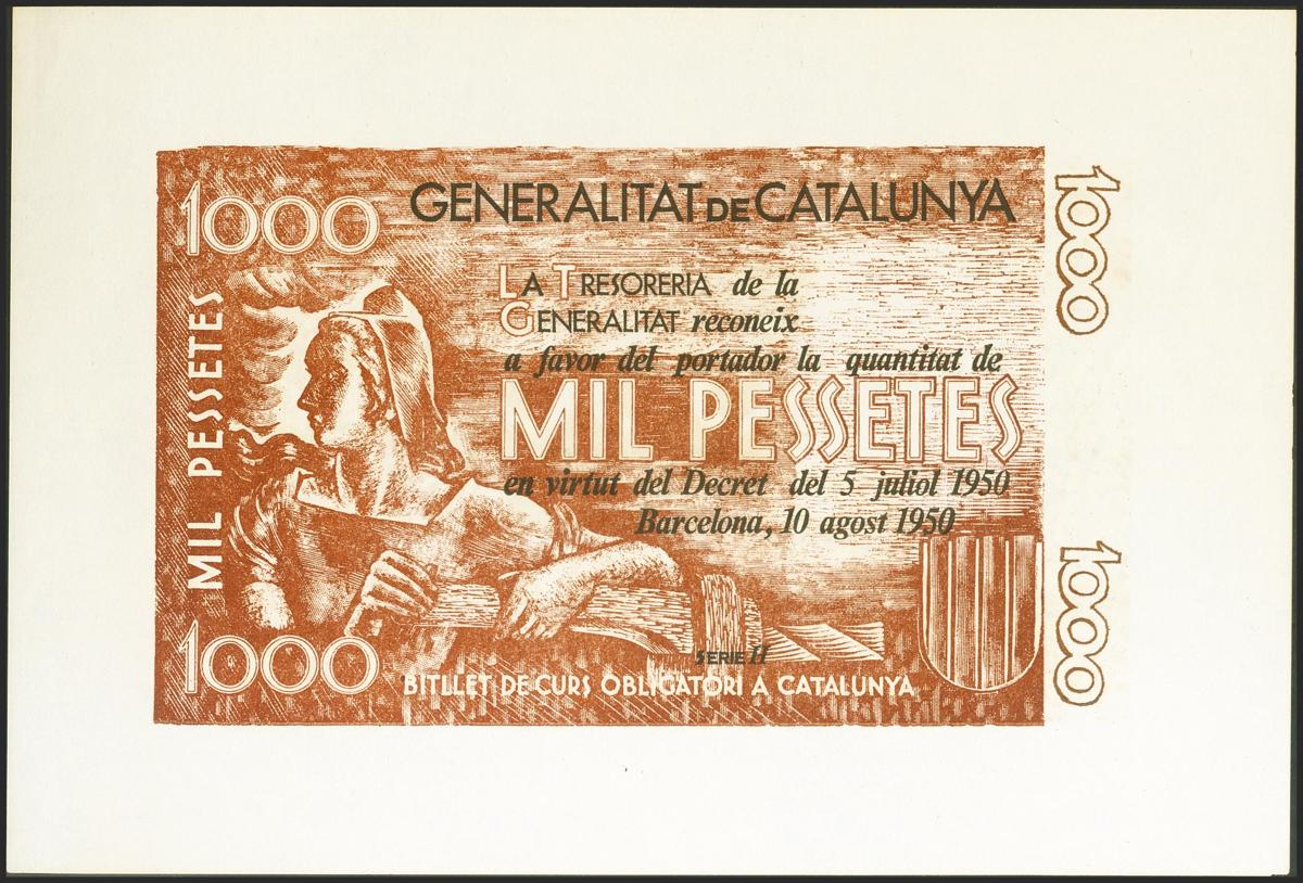 Prueba en color castaño de un billete No Emitido de la Generalitat de Catalunya de 1000 Pesetas, emitido el 10 de Agosto de 1950, con la serie H. (billete emitido privadamente, sin respaldo legal)