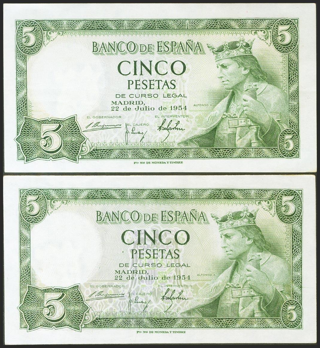 5 Pesetas. 22 de Julio de 1954. Pareja correlativa. Serie V. (Edifil 2021: 466a). Conserva gran parte del apresto original. EBC+.