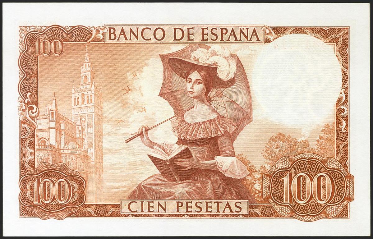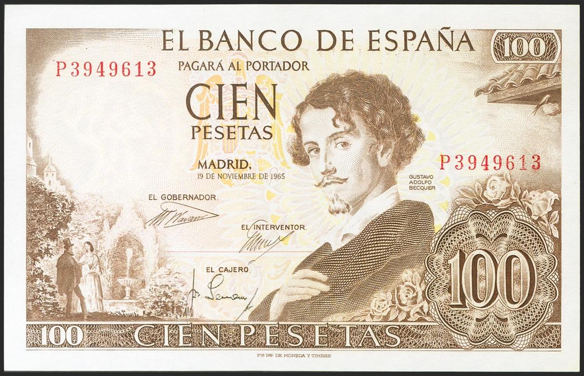 100 Pesetas. 19 de Noviembre de 1965. Serie P. (Edifil 2021: 470a). Conserva la mayor parte del apresto original. EBC+.